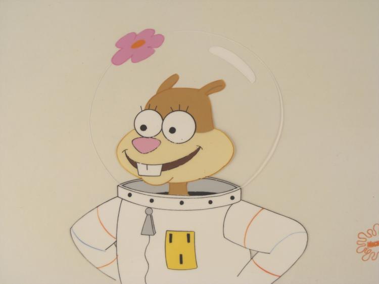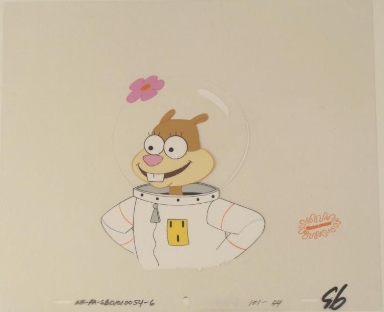This original animation cel is from the Nickelodeon TV show SpongeBob Squarepants. The story takes place under the deep blue sea in Bikini Bottom, where SpongeBob resides. SpongeBob, who is a yellow, porous sponge, is your typical happy-go-lucky character, as he is always cheerful and enjoys making people laugh. Patrick Star, SpongeBob's neighbor who is a starfish, is your average children's show idiot, as he boasts knowing nothing and is often getting himself into ridiculous situations. Between the homes of these two lies the home of the miserable Squidward, a squid, who is known for being grouchy and playing tricks on SpongeBob and Patrick. Both SpongeBob and Squidward work at the Krusty Krab, a fast food business run by the greedy money-loving Mr. Krabs, a crab, the arch rival of the evil, possibly misunderstood, Plankton. Another neighbor, Sandy Cheeks, an athletic squirrel who normally wears an astronaut's space suit, was introduced in "Tea at the Treedome." She spends most of her time inventing and experimenting. * Isn't this space suit super cool? * Original Production Animated Cel Overall Size of Cel: 10 1/2" x 12 1/2" Very Good Condition This is an original hand-painted cel set-up used in the production of an episode of "SpongeBob SquarePants." Each one-of-a-kind set-up represents a slight change in position of the characters. When individually photographed and projected in rapid succession, the images appear to move. * To create production cels, the original animator's drawing is transferred onto an acetate cel (by hand-inking and/or photo copying). The cel is then hand-painted on the reverse side. * The cel received by the winning bidder may be ever so slightly different from the one in the auction photos. * The cel is ready to be matted and framed. The animator's notations are at the bottom of the cel. There is some slight paint fade to Sandy's outline. The Nickelodeon logo is located at the bottom right of the cel. *