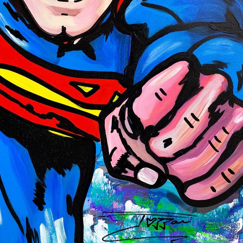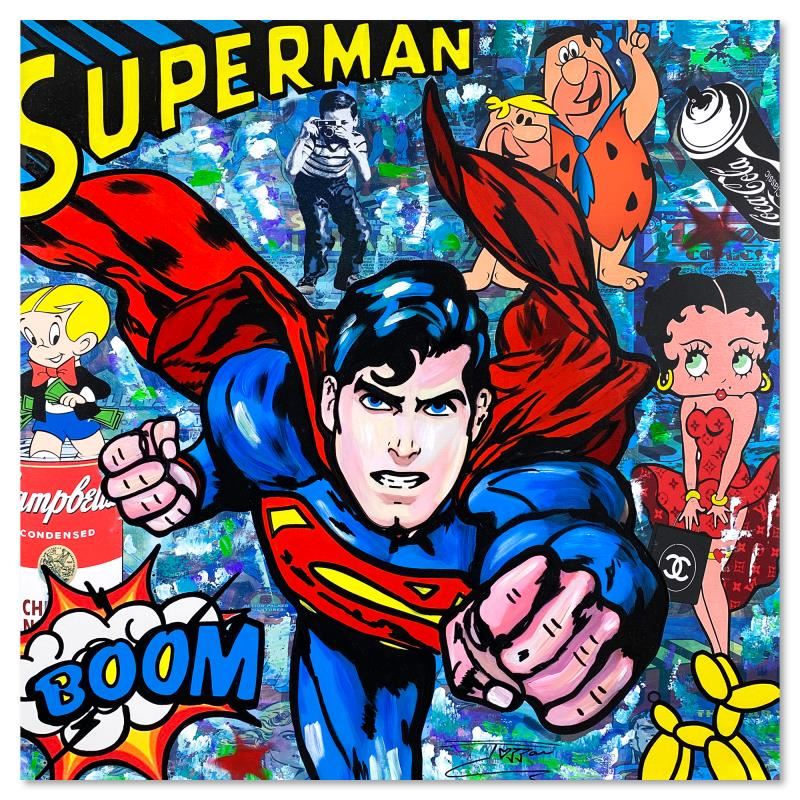 "Super Friends" is a unique mixed media acrylic on gallery wrapped canvas by Jozza. This piece is hand signed and titled in verso. Includes Letter of Authenticity. Measures approx. 38" x 38" (image).