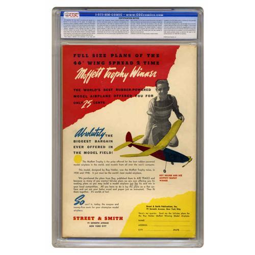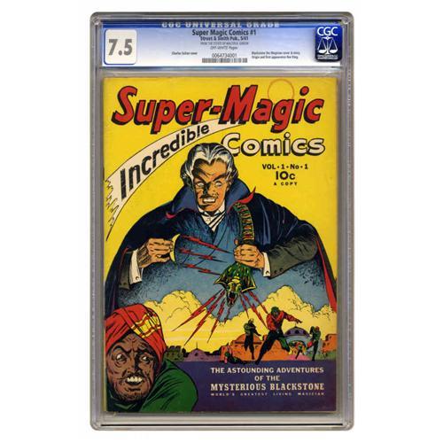 <B>Super Magic Comics #1 (Street & Smith, 1941) CGC VF- 7.5 Off-white pages.</B></I> This comic book, featuring the fictionalized exploits of real-life "super magician" Harry Blackstone, is noted by CGC, "From the Estate of Walter B. Gibson." Mr. Gibson was, of course, the famous pulp writer responsible for penning (under the name Maxwell Grant) the adventures of the Shadow. Gibson was a life-long admirer of magic acts and magicians, and a personal friend of Blackstone. No doubt Gibson also had a hand in writing this comic as well. Cover art is supplied by Charles Sultan. The comic also includes the first appearance and origin of Rex King. Overstreet 2005 VF 8.0 value = $963. CGC census 12/05: 1 in 7.5, 1 higher.