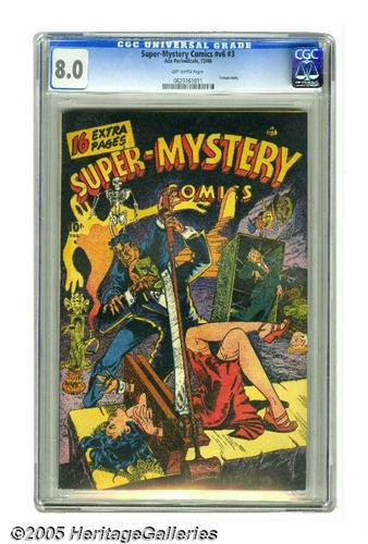 <B>Super-Mystery Comics V6#3 (Ace, 1946) CGC VF 8.0 Off-white pages.</B></I> The cover is the point of interest here -- a guillotine, torture, a skeleton, a ghost, and a decapitated head are just a few of the horrific things on display! Gerber assigned this book a scarcity rating of 7 as well as the "classic cover" designation. Overstreet 2005 VF 8.0 value = $150. CGC census 4/05: 1 in 8.0, higher.
