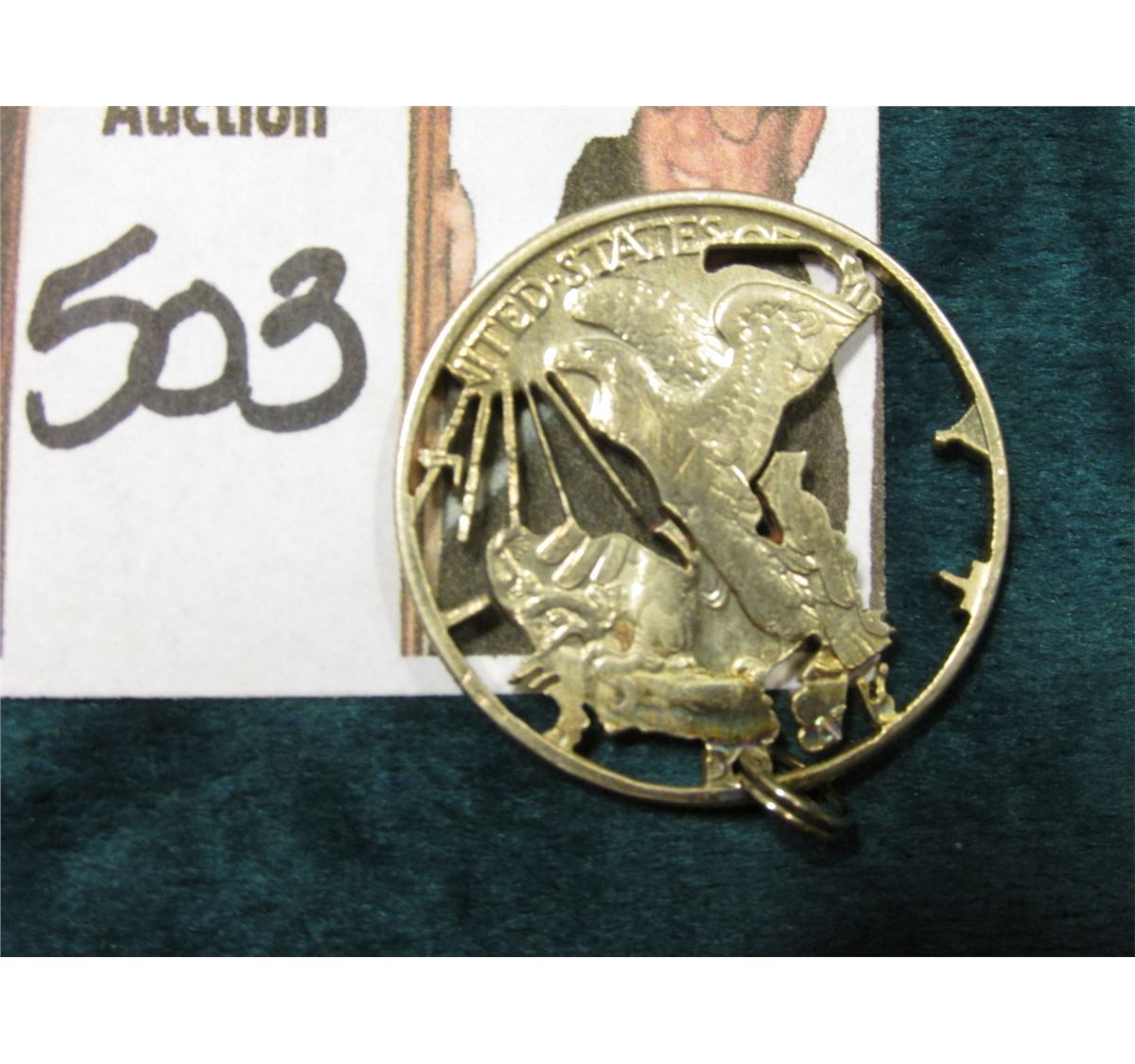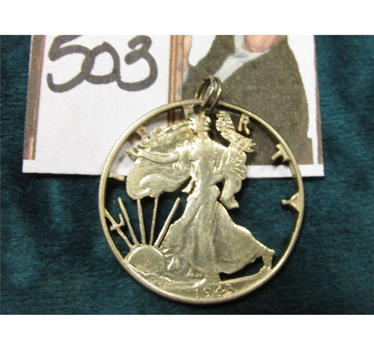Super Piece of Cut-out Art: 1943 Walking Liberty Half Dollar made into a pendant with design and lettering all excellently cut out.
