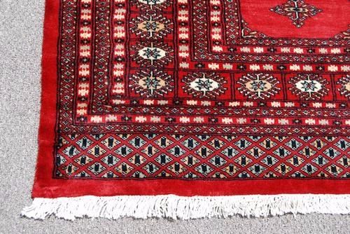Super quality handmade fine Bokhara rug, size 6 x 8.10 feet, made of all natural, vegetable dye, hand woven, worsted wool pile on cotton foundation. This is a beautiful Bokhara the wool pile is so soft that it feels like velvet to the touch. All over geometric design, please notice the extra skirt at both ends, celebrating the start and finish of the weaving process. Creases are due to fold and not a defect. It is noteworthy that the production of Bokhara rugs have dwindled substantially in the past couple of years and therefor effecting their availability in the marketplace, making them subsequently more desirable and sought after. Hand woven in Pakistan.