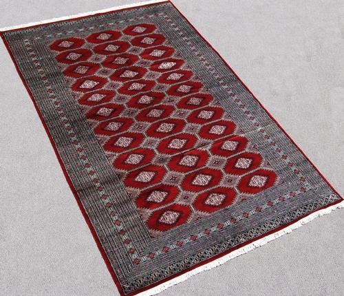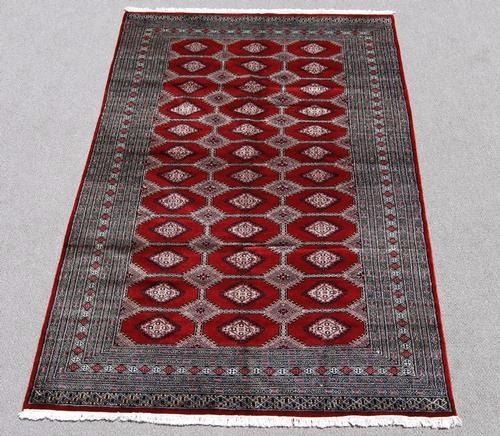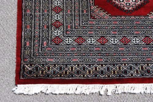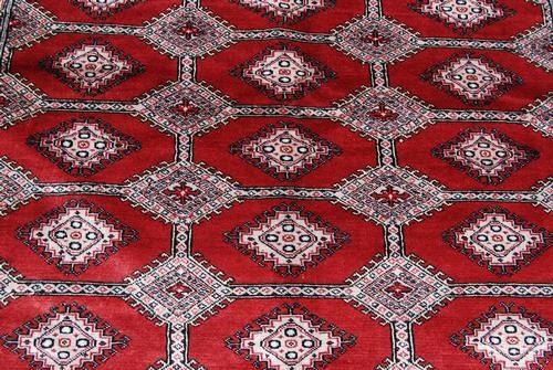Super quality hand made fine Bokhara rug, size 6 x 9.6 feet, made of all natural, vegetable dye, hand woven, worsted wool pile on cotton foundation. This is a beautiful Bokhara the wool pile is so soft that it feels like velvet to the touch. All over geometric design, please notice the extra skirt at both ends, celebrating the start and finish of the weaving process. Creases are due to fold and not a defect. It is noteworthy that the production of Bokhara rugs has dwindled substantially in the past couple of years and therefor affecting their availability in the marketplace, making them subsequently more desirable and sought after. Hand woven in Pakistan.