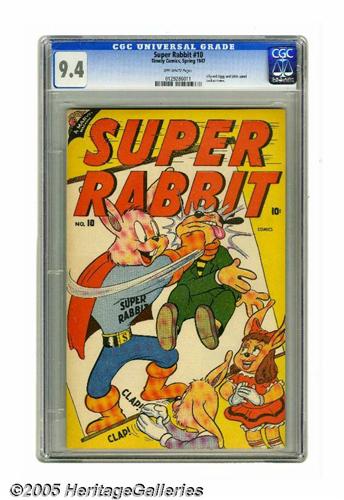 <B>Super Rabbit #10 (Timely, 1947) CGC NM 9.4 Off-white pages.</B></I> This is the only copy of this issue that CGC has certified to date. Overstreet 2005 NM- 9.2 value = $150. CGC census 5/05: 1 in 9.4, none higher.