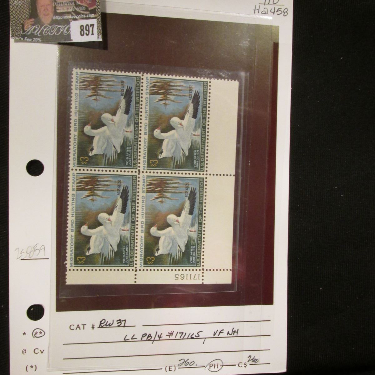 Super Rare Plate Block of Four 1970 RW37 $3 "Ross' Geese" U.S. Department of the Interior Migratory Bird Hunting Stamps. Full original gum.
