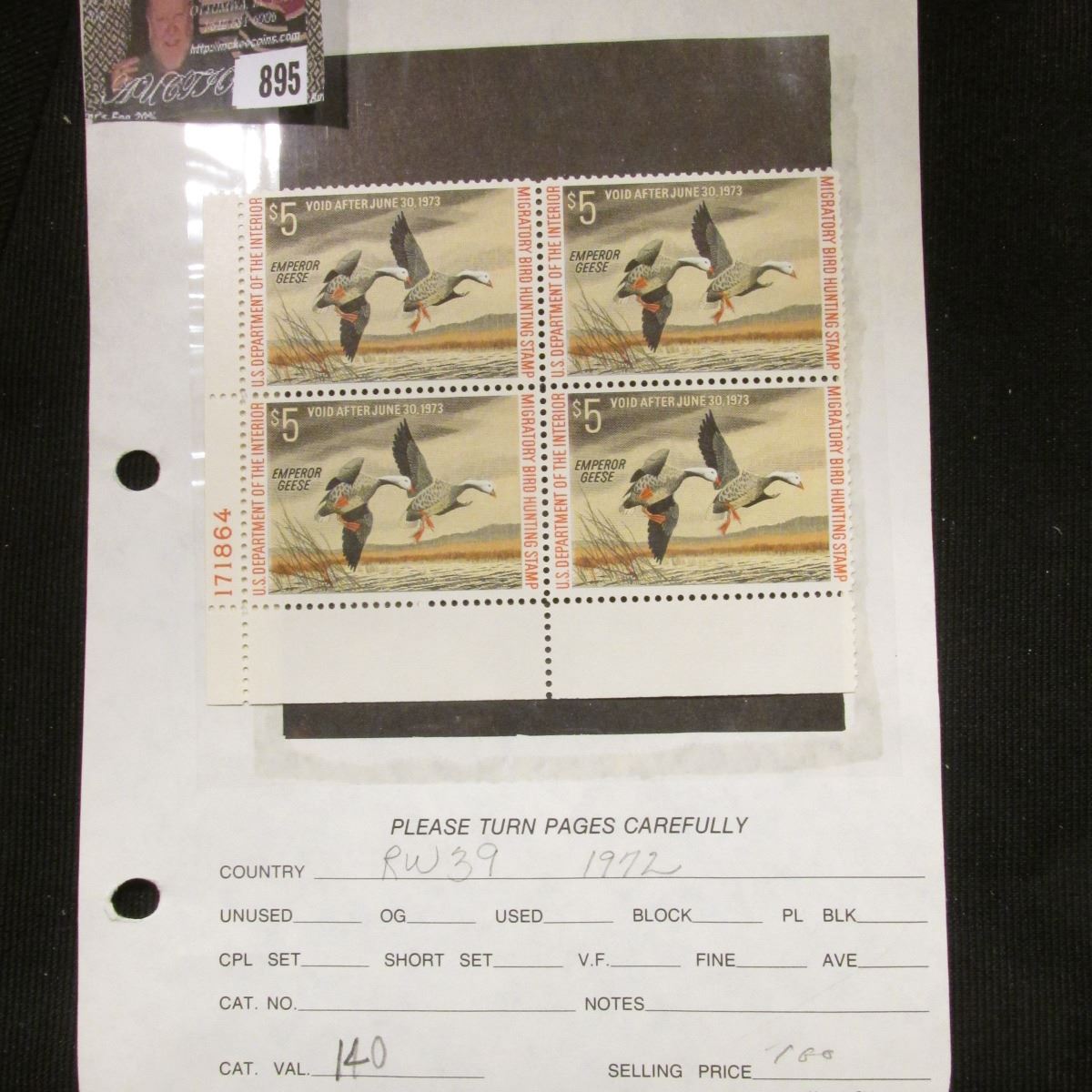 Super Rare Plate Block of Four 1972 RW39 $5 "Emperor Geese" U.S. Department of the Interior Migratory Bird Hunting Stamps. Full original gum.