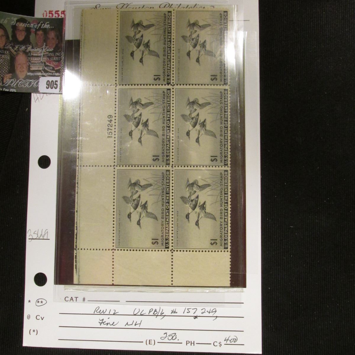Super Rare Plate Block of Six 1945 RW12 $1 "Shoveler" U.S. Department of the Interior Migratory Bird Hunting Stamps. Original gum.