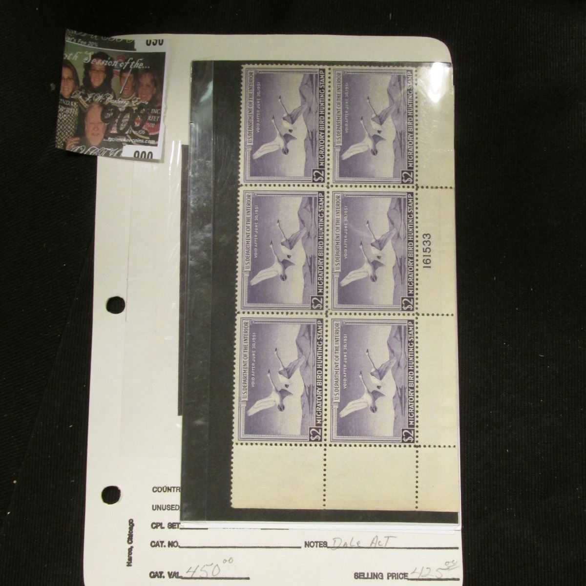 Super Rare Plate Block of Six 1950 RW17 $2 "Trumpeter Swan" U.S. Department of the Interior Migratory Bird Hunting Stamps. Original gum.