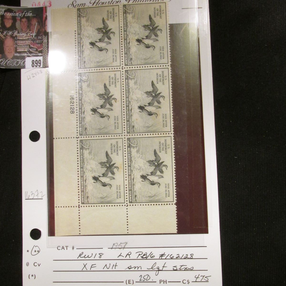 Super Rare Plate Block of Six 1951 RW18 $2 "Gadwall" U.S. Department of the Interior Migratory Bird Hunting Stamps. Original gum.