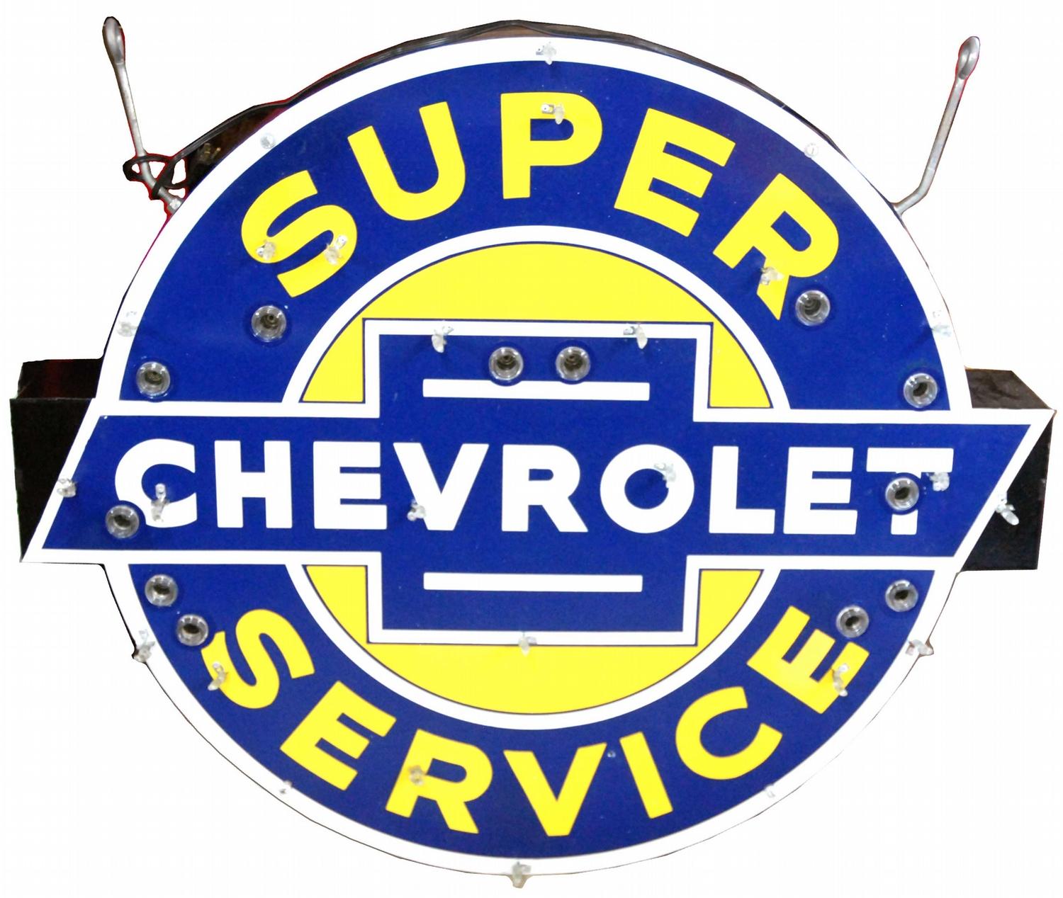Super Service Chevrolet Porcelain Neon Sign. Single Side. Some minor professional restoration otherwise very good working condition. 42 inches.