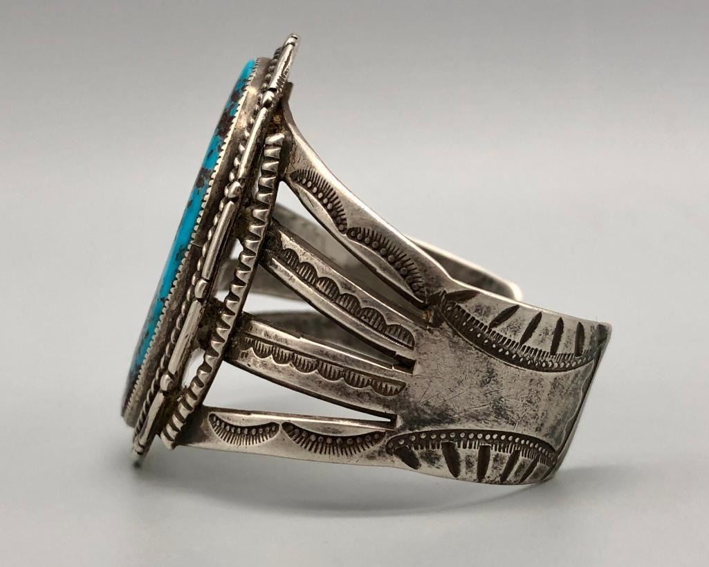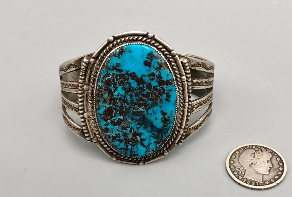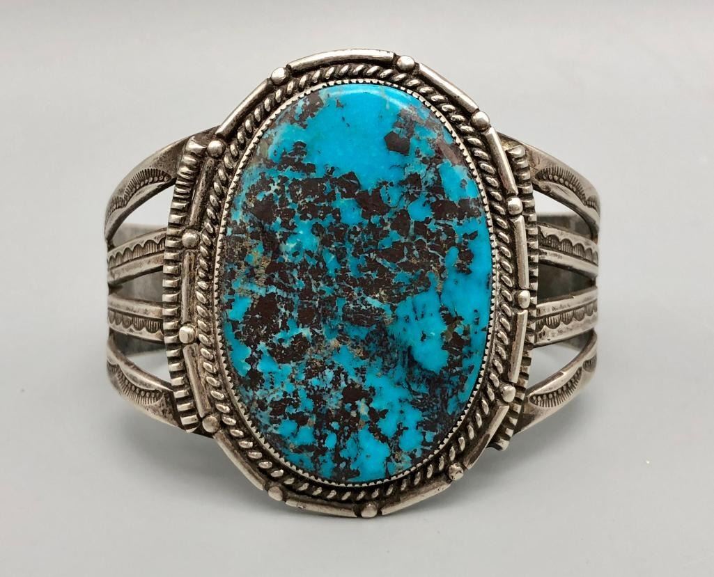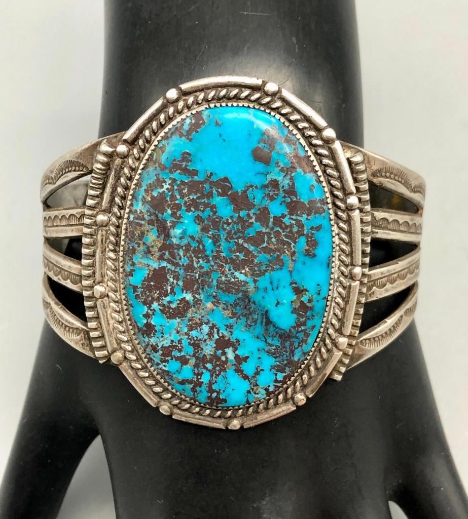 Offered for sale in this lot is a super turquoise and sterling silver vintage bracelet. This bracelet is set with a stunning, large turquoise stone, with a bold matrix. It has nice split shank style cuff, with hand stamped designs. It does have twisted wire and other detailed silverwork. It is made from sterling silver. MAKER: Unmarked. APPROX AGE: Circa 1970s. SIZE: Inside circumference measures 5-1/2 inches long. Opening is an additional 1-3/8 inches, fitting a 6-7/8 inch wrist. Width is 2-1/8 inches. Weighs 66.4 grams. CONDITION: Good for its age, normal wear expected. Please look closely at the pictures as they are an important part of our description and are hereby incorporated into the description, specifically with regards to condition. SHIPPING: There will be a $5 handling / packaging fee for shipping this lot. The actual cost of postage will be added on top of that. BUY IT NOW: If you would like to buy this item now, without waiting for the auction day to bid on it, we do offer this option (which is available up to 48 hours before the actual auction starts). The “Buy it Now†price is the high estimate of this lot (plus applicable fees and the Buyer's premium is discounted to 10% when using the Buy it Now option). If you would like to exercise this option, you must contact us by email (or phone as long as you talk to someone live). Reference this lot number and your intention to "Buy it Now."