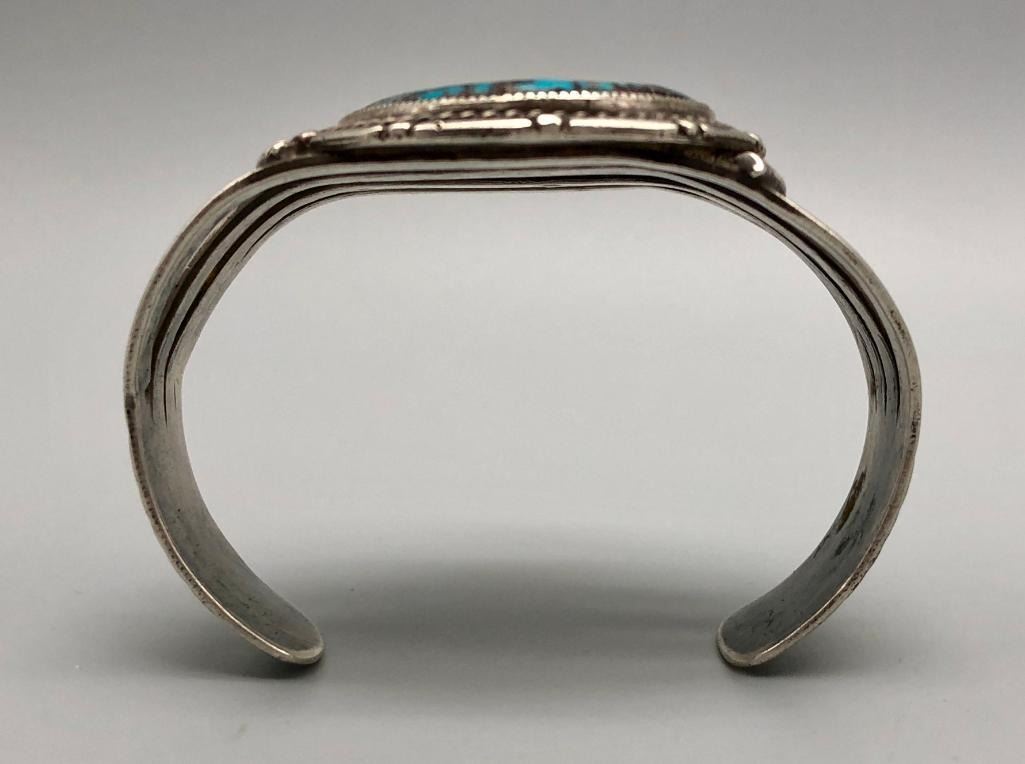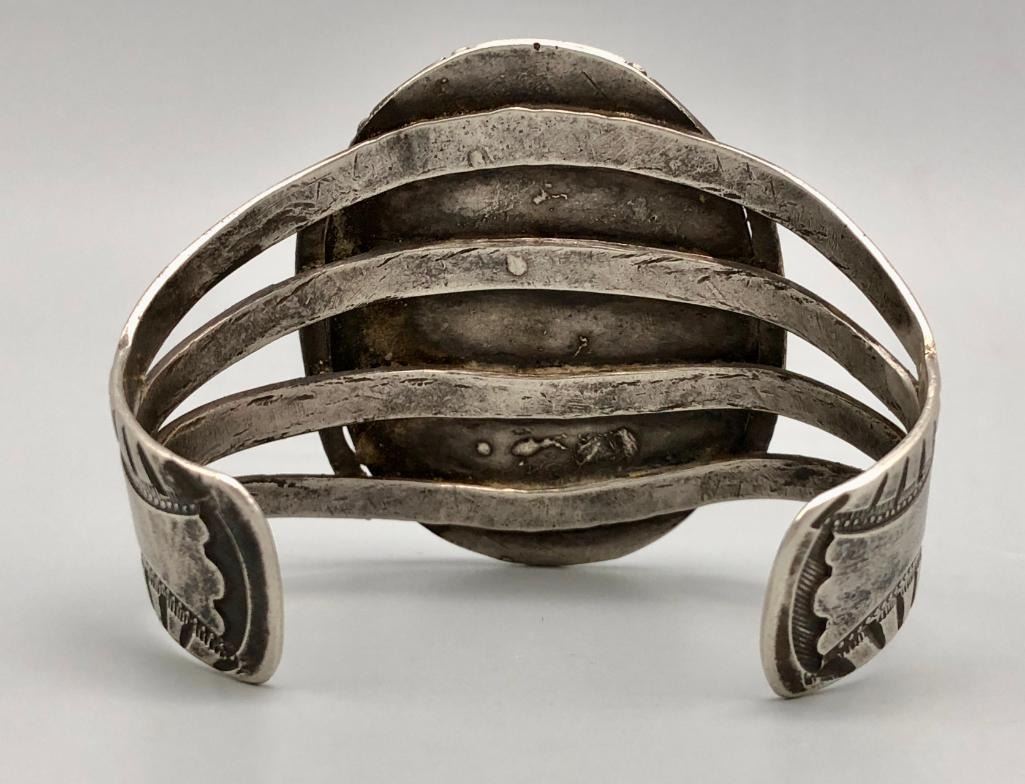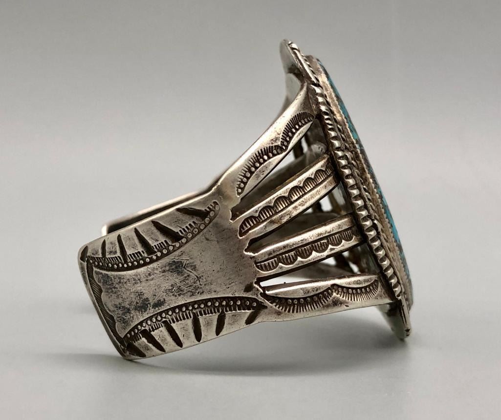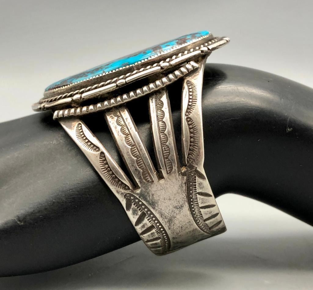 Offered for sale in this lot is a super turquoise and sterling silver vintage bracelet. This bracelet is set with a stunning, large turquoise stone, with a bold matrix. It has nice split shank style cuff, with hand stamped designs. It does have twisted wire and other detailed silverwork. It is made from sterling silver. MAKER: Unmarked. APPROX AGE: Circa 1970s. SIZE: Inside circumference measures 5-1/2 inches long. Opening is an additional 1-3/8 inches, fitting a 6-7/8 inch wrist. Width is 2-1/8 inches. Weighs 66.4 grams. CONDITION: Good for its age, normal wear expected. Please look closely at the pictures as they are an important part of our description and are hereby incorporated into the description, specifically with regards to condition. SHIPPING: There will be a $5 handling / packaging fee for shipping this lot. The actual cost of postage will be added on top of that. BUY IT NOW: If you would like to buy this item now, without waiting for the auction day to bid on it, we do offer this option (which is available up to 48 hours before the actual auction starts). The “Buy it Now†price is the high estimate of this lot (plus applicable fees and the Buyer's premium is discounted to 10% when using the Buy it Now option). If you would like to exercise this option, you must contact us by email (or phone as long as you talk to someone live). Reference this lot number and your intention to "Buy it Now."