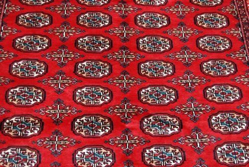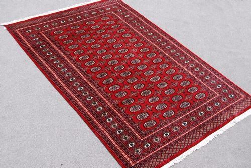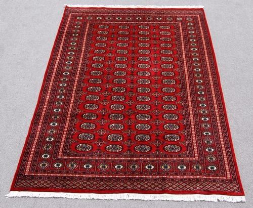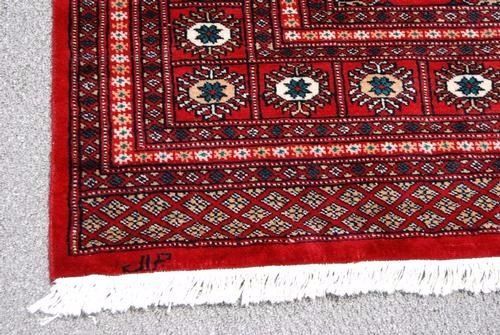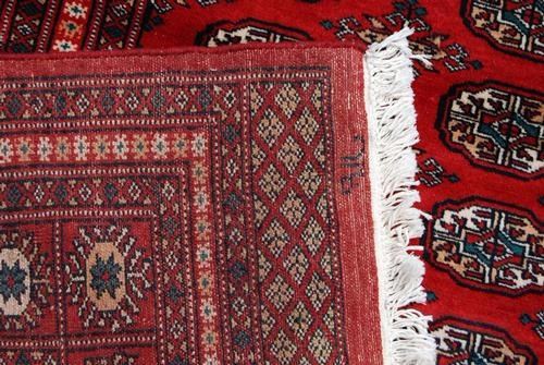 Super quality hand made fine bokhara Rug. Made of all natural, vegetable dye, hand woven, worsted wool pile on cotton foundation. This is a beautiful bokhara the wool pile is so soft that it feels like velvet to the touch. All over geometric design, please notice the extra skirt at both ends, celebrating the start and finish of the weaving process. Creases are due to fold and not a defect. It is noteworthy that the production of bokhara Rugs have dwindled substantially in the past couple of years and therefor effecting their availability in the marketplace, making them subsequently more desirable and sought after. Hand woven in Pakistan. Size: 6 feet X 9 feet.