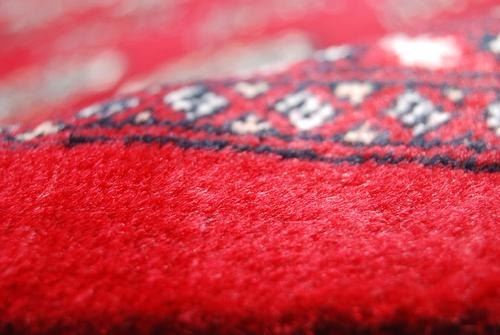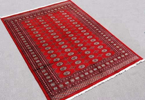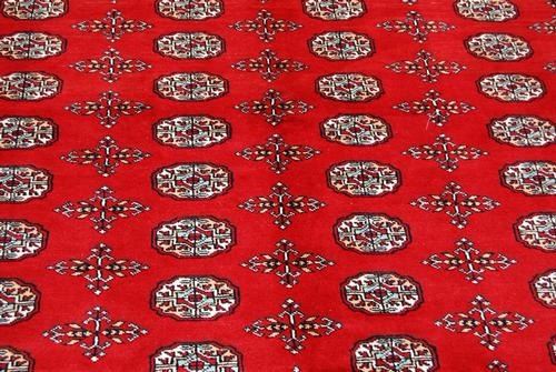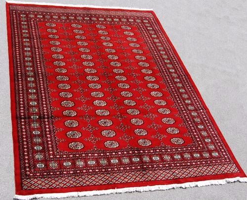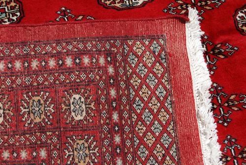Super quality handmade fine Bokhara Rug. Made of all natural, vegetable dye, hand woven, worsted wool pile on cotton foundation. This is a beautiful Bokhara the wool pile is so soft that it feels like velvet to the touch. All over geometric design, please notice the extra skirt at both ends, celebrating the start and finish of the weaving process. Creases are due to fold and not a defect. It is noteworthy that the production of Bokhara Rugs have dwindled substantially in the past couple of years and therefor effecting their availability in the marketplace, making them subsequently more desirable and sought after. Hand woven in Pakistan. Size: 6 feet 7 inches X 8 feet 10 inches.