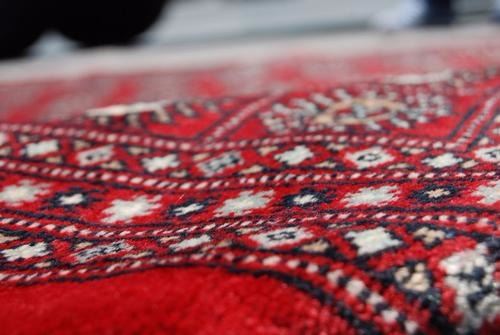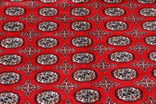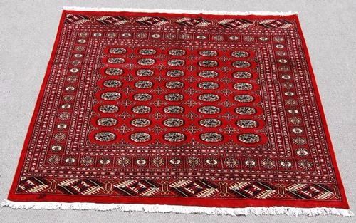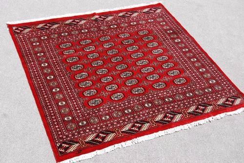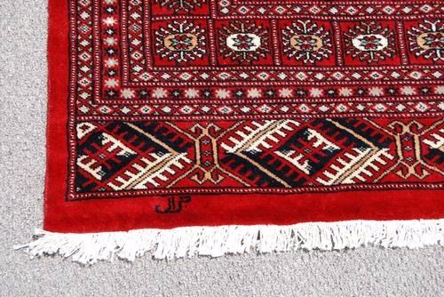 Super quality handmade fine Bokhara Rug. Made of all natural, vegetable dye, hand woven, and worsted wool pile on cotton foundation. This is a beautiful Bokhara the wool pile is so soft that it feels like velvet to the touch. All over geometric design, please notice the extra skirt at both ends, celebrating the start and finish of the weaving process. Creases are due to fold and not a defect. it is noteworthy that the productions of Bokhara Rugs have dwindled substantially in the past couple of years and therefor affecting their availability in the marketplace, making them subsequently more desirable and sought after. Hand woven in Pakistan. Size: 6 feet 6 inches X 6 feet 3 inches.