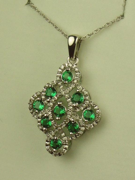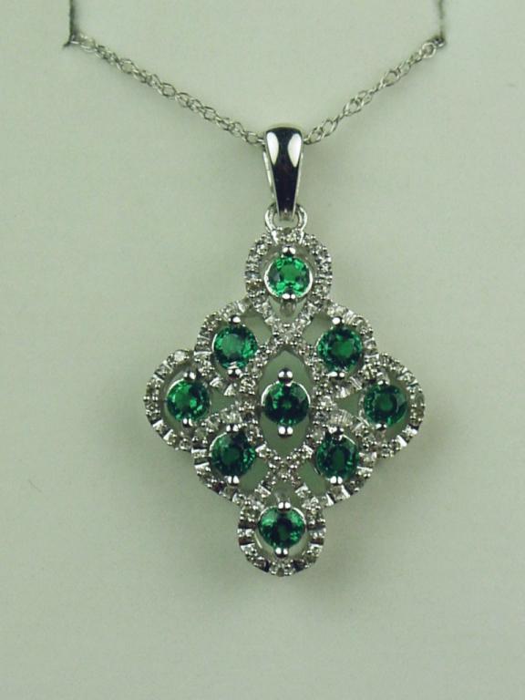 Superb 10 karat white gold ladies custom made pendant fine set with nine round created emeralds weighing approx. 1.00 carat and pave set with over 50 round diamonds weighing approx. 0.40 carats of G-H colors and SIclarity. Retail $1,450.00 Estimate $500-$800 Very labor intensive