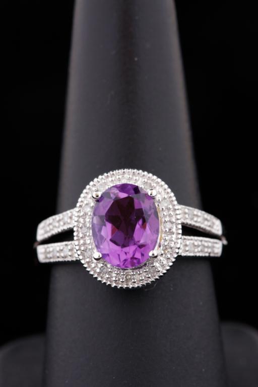Superb 10K White Gold Ladies Ring set with a center oval Amethyst weighing approx 2.00 carats and pave set with over 24 round diamonds weighing approx 0.25 carats of H-I colors and SI/I clarity. Retail $1,450.00