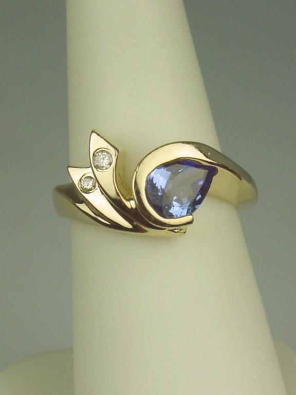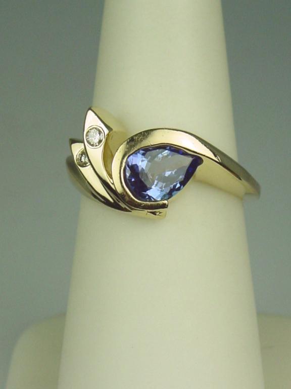 Superb 14 karat yellow gold ladies custom made ring set with a fine center pear shape Tanzanite weighing approx. 1.50 carats and side diamonds. Retail $1,650.00 Estimate $600-$800