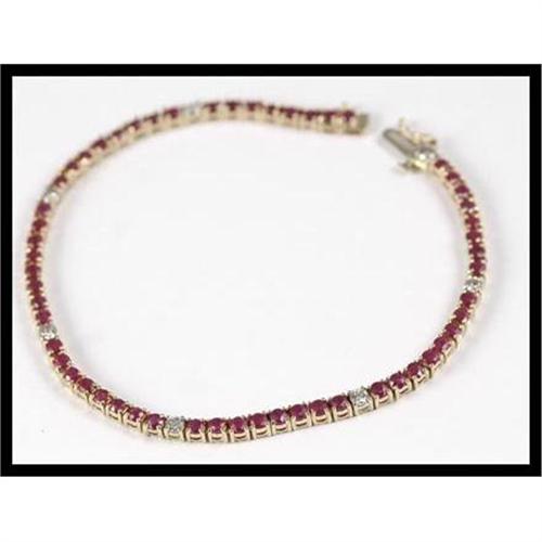 Superb bracelet with 56 round cut rubies that weigh approximately 3.50 carats and 7 full cut diamonds that weigh approximately 0.50 carats set in 14K yellow gold. The 7-1/2 inch long bracelet weighs 7.90 grams total weight.