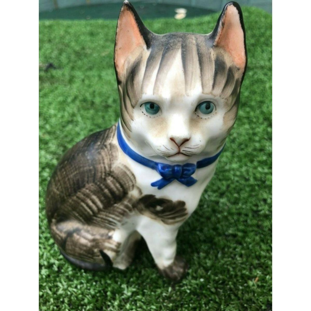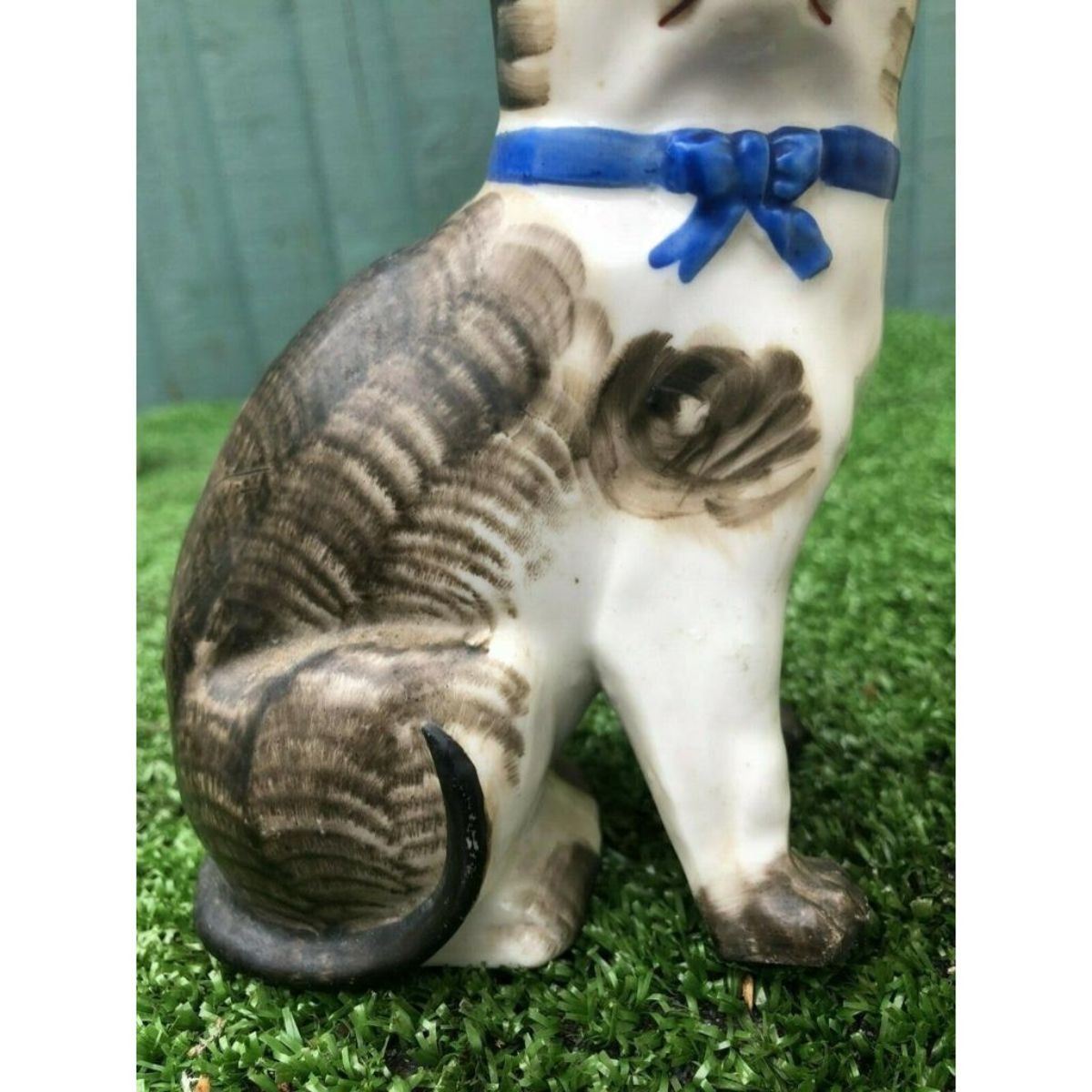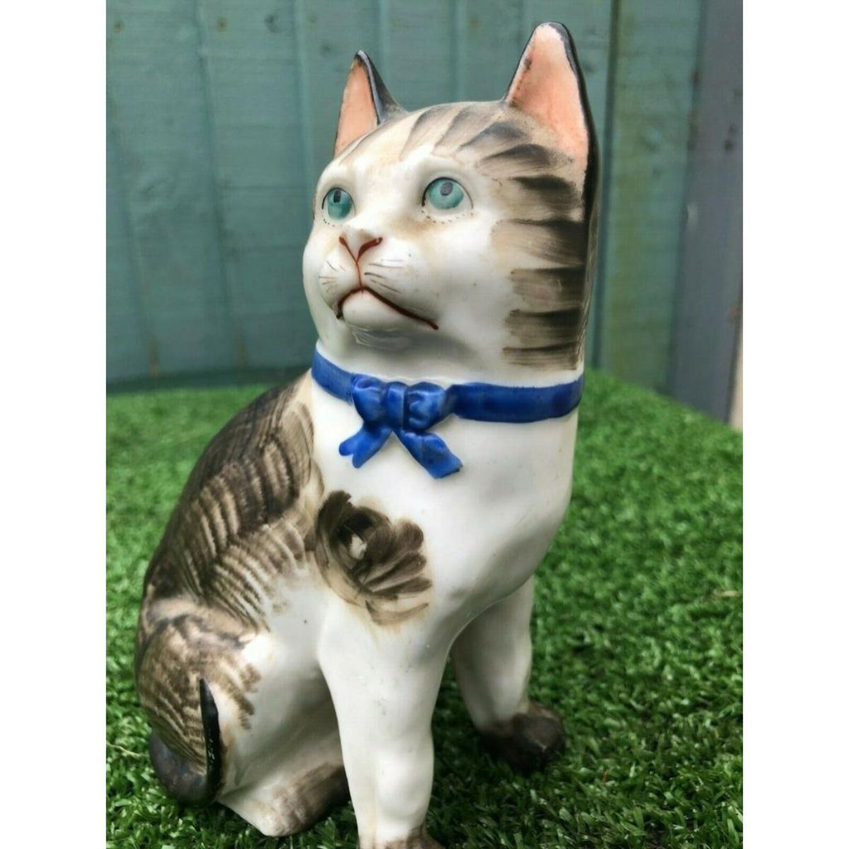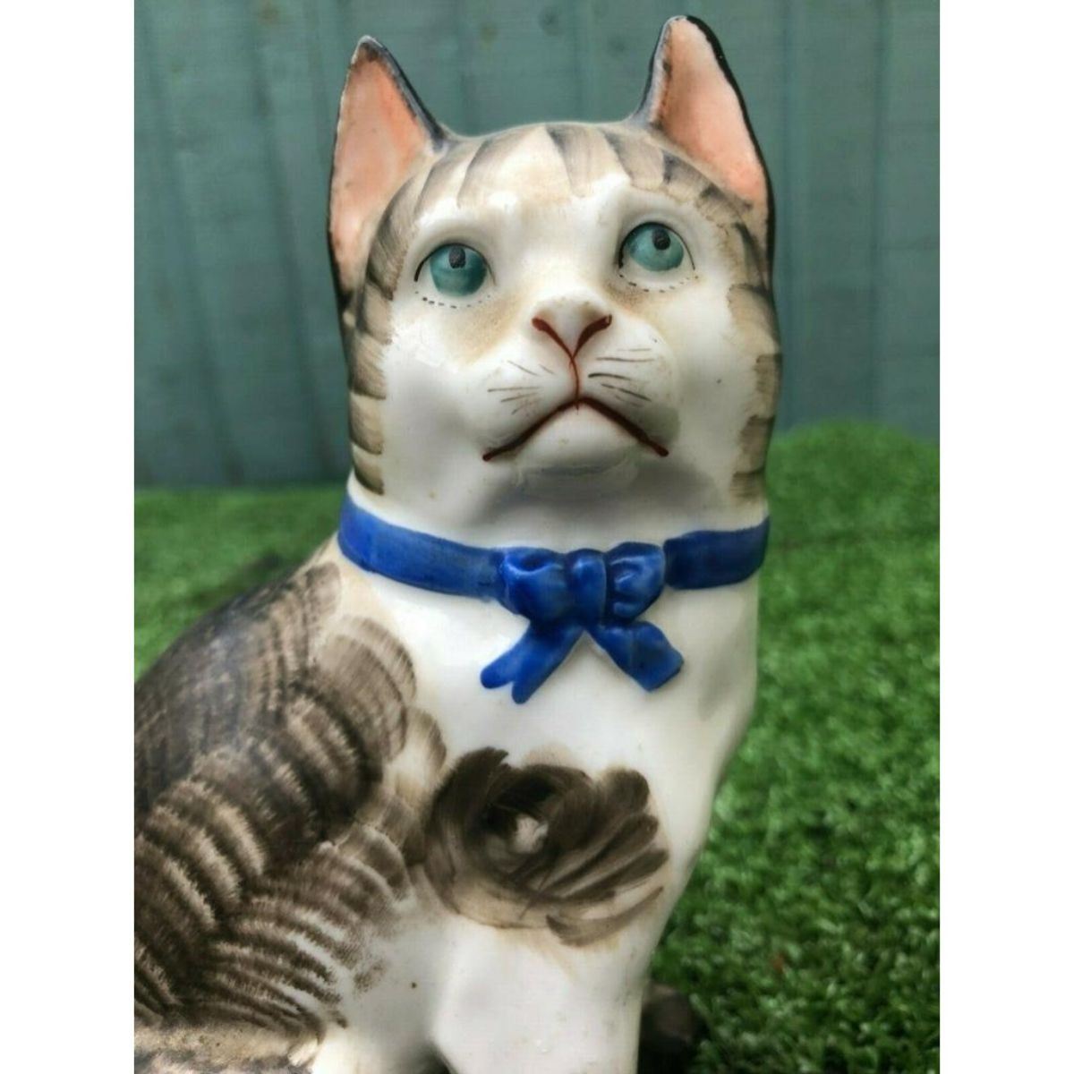 Superb c1880's Victorian English Staffordshire porcelain seated cat figure with separate front legs. Wonderful portrayal with vivid coloring & decoration. 6 1/4" H. 4" X 2 3/4" base.Â