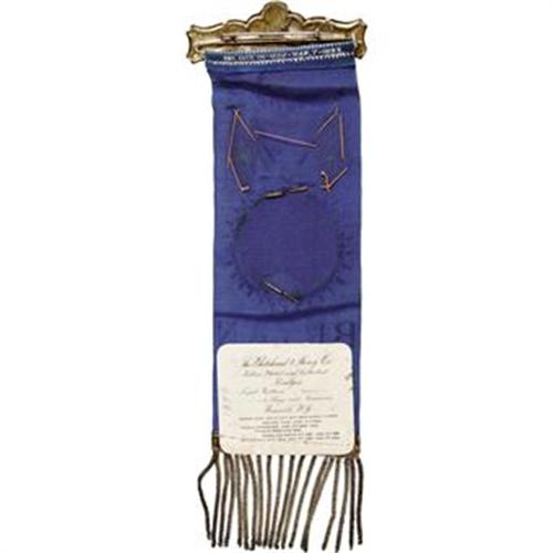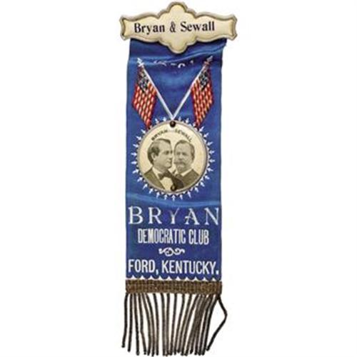 <B>Superb Bryan & Sewall Celluloid Badge,</B></I> 3" x 8.75", 1896, by Whitehead & Hoag Co., Newark, New Jersey. A 1¾" jugate celluloid disc showing the candidates is placed below crossed American flags on a blue ribbon reading "Bryan Democratic Club Ford, Kentucky". A celluloid nameplate serves as the hanger and reads "Bryan & Sewall". An exceptional and virtually mint item from Bryan's first presidential run.<BR><BR><b>Shipping:</b> Miscellaneous Collectibles, Smal (<a target="_blank" href="http://www.heritageauctions.com/common/shipping.php">view shipping information</a>)