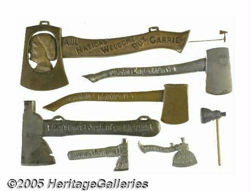 <B>Superb Collection of Six Temperance Figure Carrie Nation Hatchets</B></I> At the turn of the 19th to 20th centuries, Carrie Nation was among the most recognized personalities in America. This harmless-appearing little old lady was a ferocious advocate of the Temperance movement, and showed up at saloons, trademark hatchet in hand, to smash their stock of demon rum and the accouterments of its sale and consumption! Her supporters and detractors both seized on the symbol of the hatchet for items produced to support or oppose her. Perhaps the two most familiar to collectors are the tiny brass stick-pin, stamped "Carrie A. Nation," and the 3 3/4" metal advertising piece put out by the Art Stove Co. of Detroit, dated 1901 and bearing the legends "cut out whiskey" and "ax of all nations," along with a portrait of Carrie. The six other examples in this group are all quite unusual: 1) and 2) 9 1/4" variety with gently curving handle marked "Carrie Nation's." Both are heavy, solid brass, one nickel-plated. 3) Large 8 3/4" white metal wall plaque, marked "Nation's Joint Smasher." 4) A great massive 11" brass wall plaque, marked "All Nations Welcome But Carrie" (clearly for saloon display!) and her portrait. 5) A most unusual 3 3/4" variety with wooden handle, the blade simply marked "Nation." 6) A 3 3/4" white metal hatchet marked "Carrie Nation's joint smasher." Lot:262