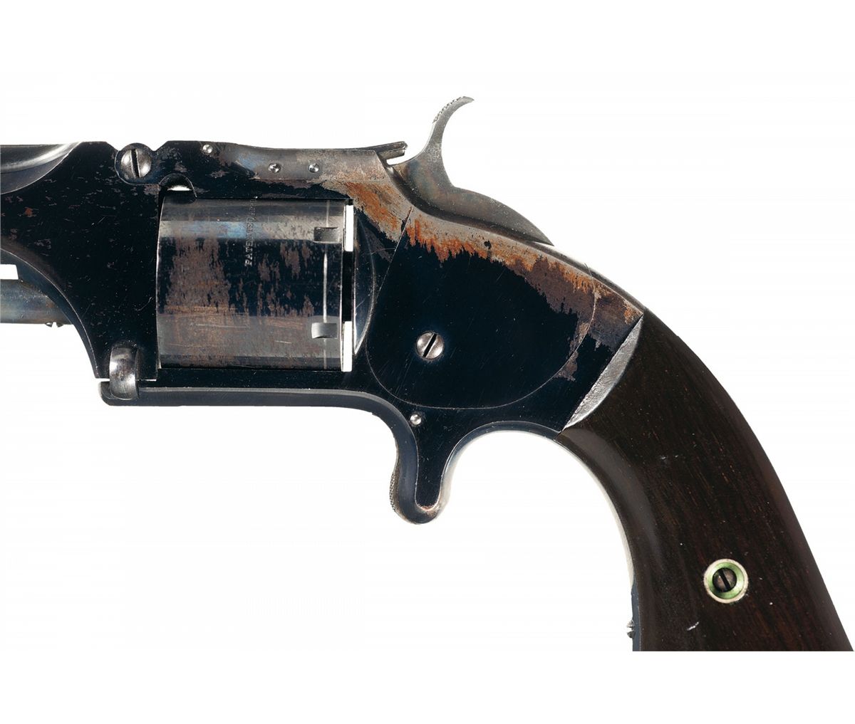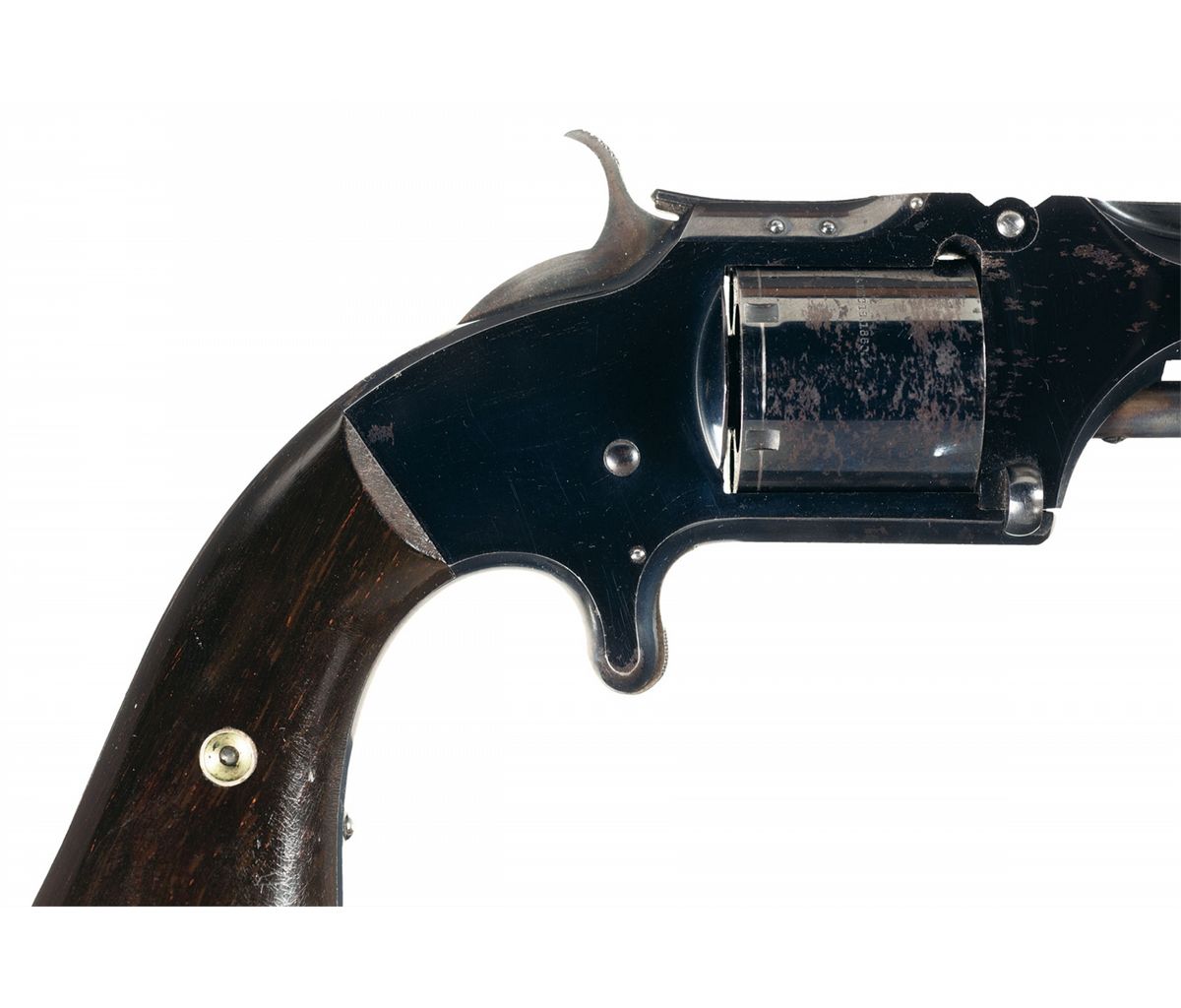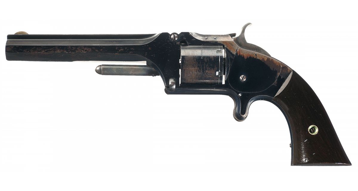Manufactured from 1861-1874. Round blade front sight with notched rear sight. The barrel is marked "SMITH & WESSON SPRINGFIELD MASS." on top of the rib, with the patent marking around the cylinder and the assembly number "LL1" on the barrel lug and cylinder. Fitted with a casehardened, checkered hammer and trigger, and a pair of smooth rosewood grips with a flared butt.