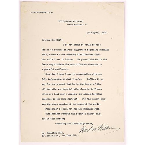 <Our item number 139745><B>Wilson, Woodrow.</B> (1856-1924) 28th President of the United States. Superb content typed letter signed, on his personal letterhead, 1p, 9½ x 7 in., Washington, 25 April 1921. To Hamilton Holt (1872-1951), editor and publisher of the liberal weekly The Independent and a founder of the NAACP, responding to a letter from Holt in which he stated that in light of French General Ferdinand Foch having been de facto supreme commander of Allied forces during World War I, Congress should consider offering him, upon his visit to the U.S., a pension or other gift, as it had done with Lafayette 150 years earlier. <BR><BR>Wilson responds angrily: "…I was entirely disillusioned about him while I was in France. He proved himself in the Peace negotiations the most difficult obstacle to a peaceful settlement…. he is the leader of the militaristic and imperialistic elements in France which are bent upon reversing the Alsace-Lorraine business in the Ruhr District. For the m oment they are the worst enemies of the peace of the world. Personally I could not receive Marshall Foch…." Very good; light toning and wear. Wilson's bold but tremulous signature is a result of the stroke he suffered in 1919. Accompanied by a carbon copy of Holt's reply to Wilson's letter and a 1931 autograph letter signed by Holt, giving Wilson's letter to a Mrs. Johnson and explaining the circumstances surrounding it.<BR><BR>When Foch visited the U.S., Wilson did indeed decline a visit, citing his poor health. During the negotiation of the Treaty of Versailles, the French, largely represented by Clemeançeau and Foch, took a hard stance. They demanded the return of the Alsace-Lorraine region to France, the complete demilitarization of the Ruhr, and enormous war reparations, among other concessions. Wilson strongly objected and the U.S. Senate refused to ratify the treaty with which Wilson was forced to return, effectively hamstringing the nascent League of Nations envisioned by Wilson. As for Foch, when the Treaty of Versailles was signed, he said: "This is not peace. It is an armistice for 20 years." And, of course, it was. <BR>Estimated Value $5,000 - 6,000. <BR><BR>Our item number 139745<BR><IMAGES><P ALIGN="CENTER"><IMG SRC="http://www.goldbergcoins.net/liveauction/49jpegs/139745.jpg"> <BR><IMG SRC="http://www.goldbergcoins.net/liveauction/49jpegs/139745N2.jpg"> </P></IMAGES>