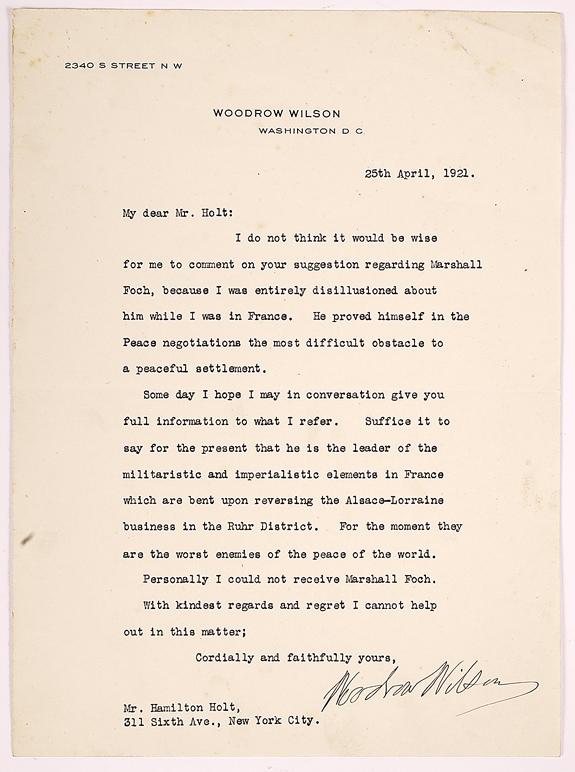 Wilson, Woodrow (1856-1924) 28th President of the United States (1913-1921). Superb content typed letter signed, on his personal letterhead, 1p, 9½ x 7 in., Washington, 25 April 1921. To Hamilton Holt (1872-1951), editor and publisher of the liberal weekly The Independent and a founder of the NAACP, responding to a letter from Holt in which he stated that in light of French General Ferdinand Foch having been de facto supreme commander of Allied forces during World War I, Congress should consider offering him, upon his visit to the U.S., a pension or other gift, as it had done with Lafayette 150 years earlier.