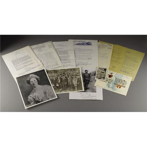 <B>Superb Correspondence by Helen Dortch Longstreet, Widow of Confederate General James Longstreet.</B></I> Over 130 typed letters signed, documents signed, copies of typed manuscripts, and retained copies of letters on various letterheads including Longstreet Memorial Association stationery, all addressed to historian Carl W. Breihan, spanning the years 1945-1949. All good content, including her efforts to build a memorial to honor her husband James on the field of Gettysburg as well as a run for office and various other public service campaigns. In small part; "<I>October 19th, 1945... after two years in a war production plant, I do not find it easy to reconvert my activities to normal living... Be assured of my deep appreciation of your interest in the proposed Longstreet monument on the Gettysburg field... If we could formulate a plan for securing $2 contributions from about 150,000, that would supply the monument fund and an additional amount to cover the expenses of unveiling... October 29th, 1945... The raising of funds for the Longstreet Monument is a difficult problem. General Longstreet has been dead forty-one years and the rank and file of the present generations know nothing about him. His Republican politics caused the Solid South to rise in arms against him in the reconstruction period and make the infamous charge that he disobeyed Lee's orders at Gettysburg and lost the Confederate cause. The Daughters of the Confederacy and Southern writers, have kept alive the shameless slander; so no help can be had from them. The old Confederate veterans who organized the Longstreet Memorial Association could not give it one dollar of support. The movement has been financed by me... and just as we were about ready to launch a drive for funds, the world war interrupted and all our efforts had to be devoted to winning the war... February 27th, 1946... A friend of mine has suggested that it would be a good plan for me to make personal calls on millionaires and multi-millionaires throughout the country... Assuming that three men who would contribute $3,000 each could be interested in each of the forty-eight States, that would create a fund for the Longstreet monument, a bust of Longstreet in the Hall of Fame of the New York University, and a Longstreet Chair of History in some outstanding educational institution. These honors are long overdue to make amends for the cruel slander of Longstreet's honor as a soldier, that has been viciously circulated since 1872, following Pendleton's lying lecture over the South... June 4, 1946... Under separate cover I send you a picture and eleven pamphlets, SURE ROAD to WORLD PEACE. One of the pamphlets is inscribed to you. If you could sell the other ten for 25cts each, and send me the addresses of the purchasers, it would enable me to test a plan I have for selling pamphlets of a different subject, for the benefit of the Longstreet monument... in response to an inquiry made by the Better Business Bureau, she writes on July 17, 1947 ... Inasmuch as the work of the Longstreet memorial association has been in a State of suspension since the breaking out of World War II, the inquiries now being made regarding the reliability of the Association are puzzling. If the inquiries (as I suspect) were initiated by Joseph D. Smith, of Tuckerton, N.J., they are not worth of attention. Mr. Smith was named as Publicity Director for the Association for the State of New Jersey. Within the past weeks, acting without authority, he constructed himself a One Man Committee to build a monument to Gen. Longstreet on the Gettysburg field... After considerable work along this line Smith finally wrote to Mr. Coleman, Gettysburg Battle Park Commissioner, and later, to me. Mr. Coleman advised Mr. Smith that he would not be permitted to erect anything on the Longstreet Monument site that had not been approved by me... Smith's conduct has been most unusual and unworthy of a man of the highest integrity. Mr. Coleman concurs with me that Smith's methods for raising money are to be watched. If he is collecting funds for the Association, or pretending to act for the Association, he is without authority... Sept. 10, 1947... Everybody's mail is burdened with appeals for funds to rebuild Europe, of which our own guns made a shamble; --- to feed the hungry, clothe the naked and relieve the disabled of the war lands. Never before in the history of warfare have the victors been called upon to take care of the conquered... I am beginning to wonder who won the war. The heavy burden now and for a thousand years to come, will fall on the American tax payer. Former President Hoover has very truthfully called attention to the fact that there will be an end to the ability of our United States to support the world...</B></I>" Much more good content regarding all of her efforts. Also includes re-printed photos of a portrait of her, an engraving of Longstreet, a group photo taken at a Gettysburg reunion (including Longstreet), and a small snapshot of Mrs. Longstreet taken in 1949 and signed on the verso. Should be viewed as the content is quite extensive and in-depth.<BR><BR><b>Shipping:</b> Miscellaneous Collectibles, Smal (<a target="_blank" href="http://www.heritageauctions.com/common/shipping.php">view shipping information</a>)