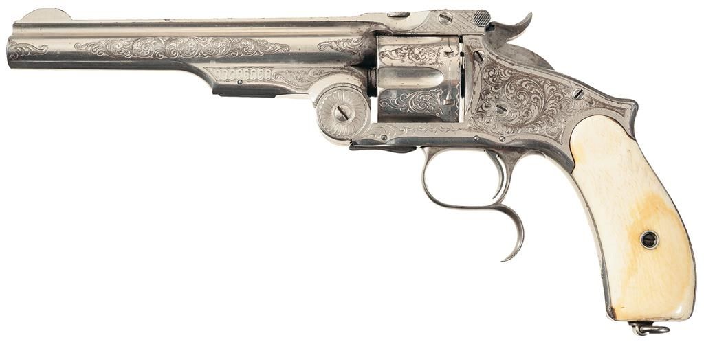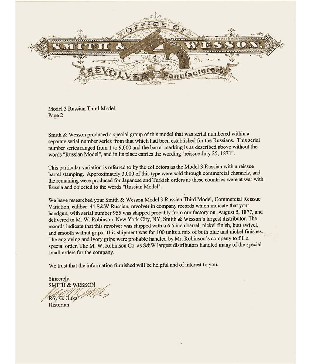 Manufactured circa 1874-1878, as one of the 9,000 Russians (both Second and Third models) produced with the "REISSUE JULY 25.1871" patent date on the rib. The majority of the "Reissue" Russian production was consumed by foreign martial contracts, particularly to Imperial Japan and Turkey, with a much smaller number entering the commercial market. Accompanied by a factory letter which states that this revolver was shipped to M.W. Robinson of New York City, Smith & Wesson's largest distributor on August 5, 1877 as a 100 unit mixed order. This revolver was shipped with a 6-1/2" barrel, nickel finish, butt swivel and walnut grips, with a note from S&W Historian Roy Jinks that the ivory grips were most likely installed by Robinson's company, which is known to have performed special order work directly for Smith & Wesson. The revolver was with out question part of a store display and was more than likely one of its centerpieces as it features a more deluxe and profuse pattern. The engraving extends from the muzzle to the butt and exhibits a beautiful scroll, vine and punch dot pattern. The revolvers most unusual motifs are exhibited on the circular barrel hinge and on the barrel latch. Fitted with a beautiful pair of ivory grips, again no question done as part of the display. Integral forged blade front sight and latch notch rear, with the large knurled takedown screw ahead of the latch and matching full serial numbers on the latch, barrel, cylinder and butt, the latter next to a boxed "1874" stamp and a small "P" inspector proof.