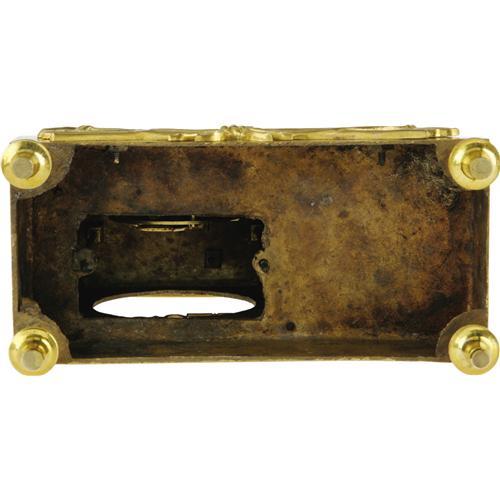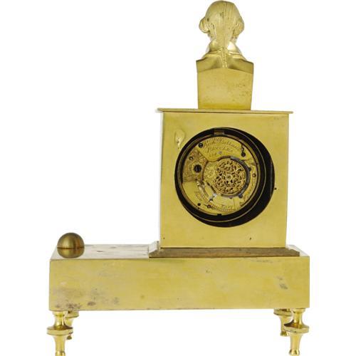 <B>Superb Early Gilt Brass George Washington Clock.</B></I> A classic clock by Richard Durrant (1776-1866), made in the English town of Beccles, a center of watch and clock-making since the mid-18th century. Features a military bust of Washington, with his name below. Condition is beautiful, and it was in working order when at the consignor's home. Original winding key is included. <BR><BR>It is possible that there was another element to the clock which is now missing, but there is no way to be certain. However, the asymmetrical form suggest that there may have been something such as a figure of Miss Liberty on the right. A round brass cap at the right corner may cover the original point of attachment. However, this is pure speculation, and this clock is a wonderful early Washington display piece as it is. Measures 5.5" x 7.25" x 2.625".