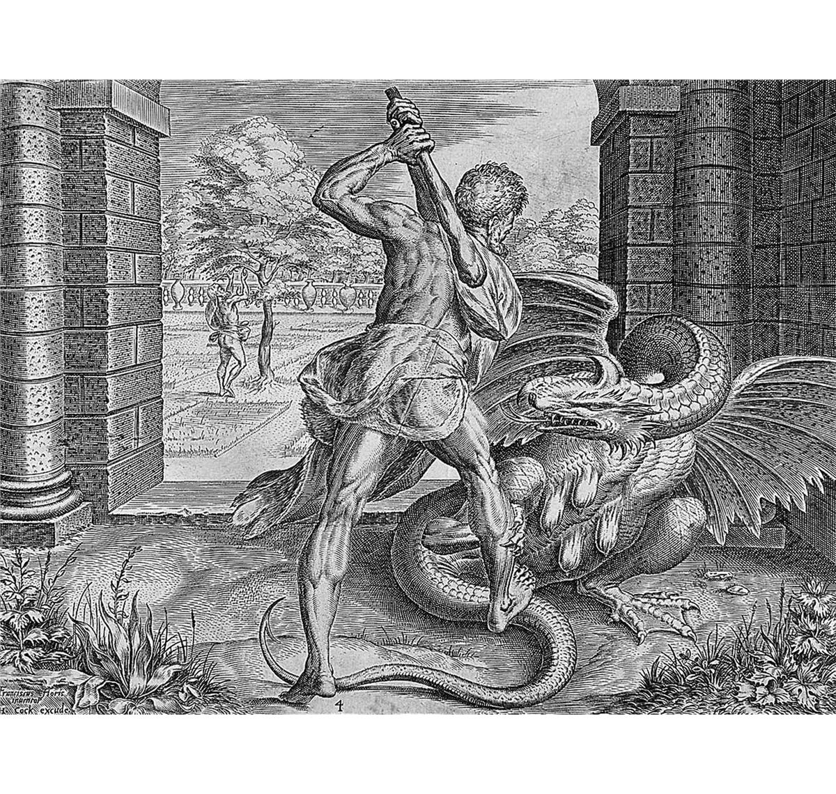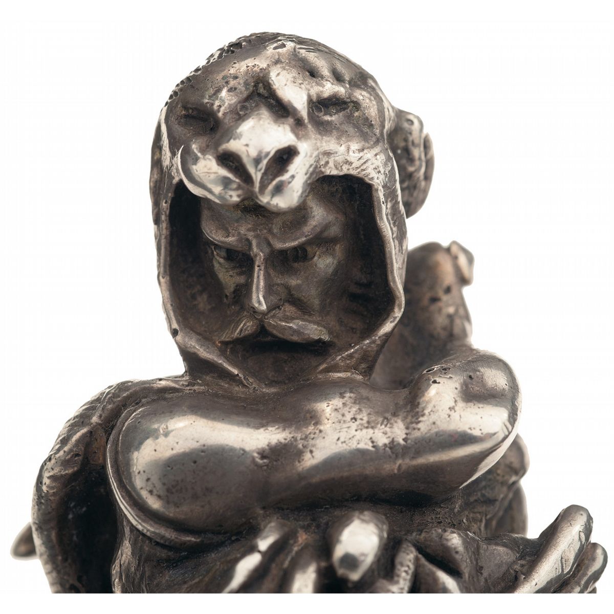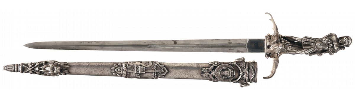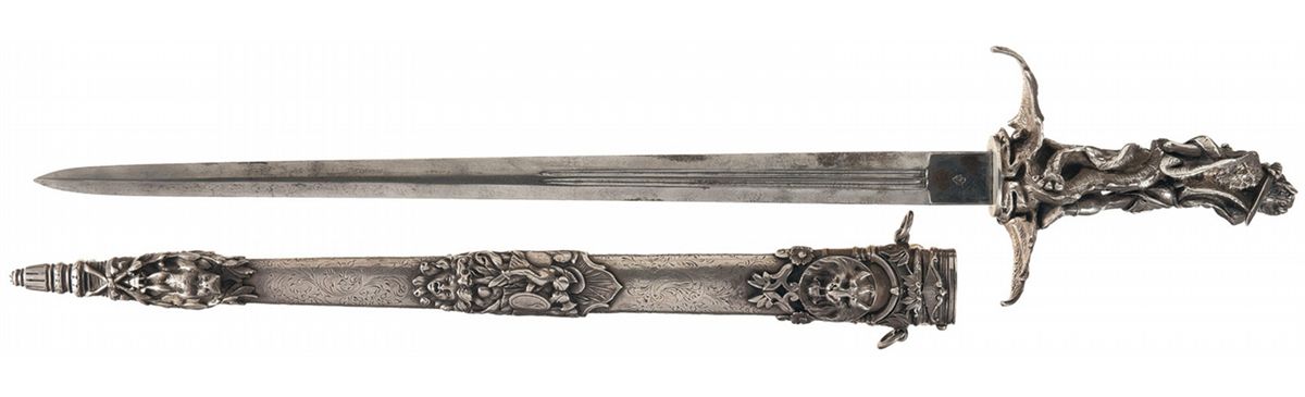 Measuring 25 inches in overall length, this sword is equipped with a double edged spear point blade, 18 1/2 inches long, with a pair of deep, thin 7 1/2 inch fullers on each side, and a square ricasso deeply stamped with a floral proof on the reverse. The blade quality is very high, perhaps from a combat weapon of the late 1600s or 1700s. The hilt of the sword is a full three dimensional rendering in cast silver of Hercules preparing to slay the dragon Ladon, with the dragon’s unfurled wings serving as a cross guard and Hercules himself as the grip and pommel. Garbed in the nigh-impenetrable skin of the Nemean Lion, Hercules has pinned the wings of Ladon with his feet and seized the beast’s tail in his left hand, while preparing to strike the fatal blow with the sword in his right. The unsleeping guardian of the Garden of the Hesperides, Ladon was the chief obstacle for the 11th Labor of Hercules, the theft of the Golden Apples, which in Greek myth served as both the Apple of Discord which started the Trojan War and the 3 Apples used in the courting of Atalanta. The level of detail, particularly on Hercules, is very high, as best demonstrated in the face, as he looks down on his soon to be dead quarry. The sheath is also silver, with extensive scroll and floral engraving on the main body, with a pair of suspension rings and attractive raised designs on the throat, mid band and tip. The throat shows cut-through scroll and floral designs and raised columns, with the head of the Nemean Lion on one side and a woman wearing a laurel (possibly representing Athena) on the reverse, the mid band has a grotesque head on each side, topped by a clash of Greek warriors and an ancient sailing ship, and both sides of the tip show an owl, wreathed with laurels.