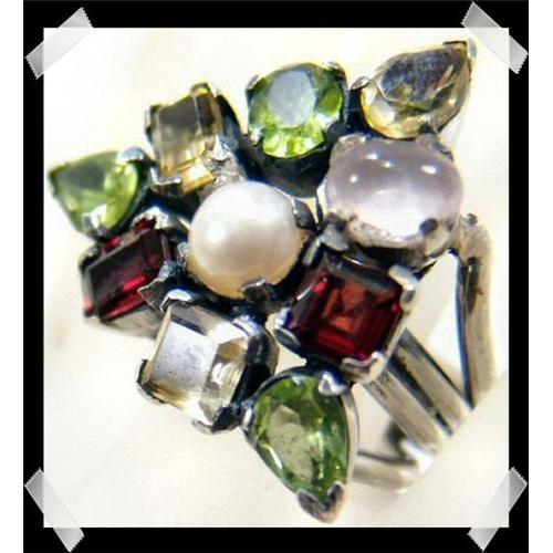 If you love all gemstones this ring is sure to please. A sparkling combination of brilliant cut citrine, garnet, peridot, and even a pearl make this tribal ring a keeper. Set in 925 sterling, tested although not stamped this ring is heavy construction for longevity. The ring is a size 8.5 with the face measuring 25x26mm. For those not familiar with metric 25mm=1".