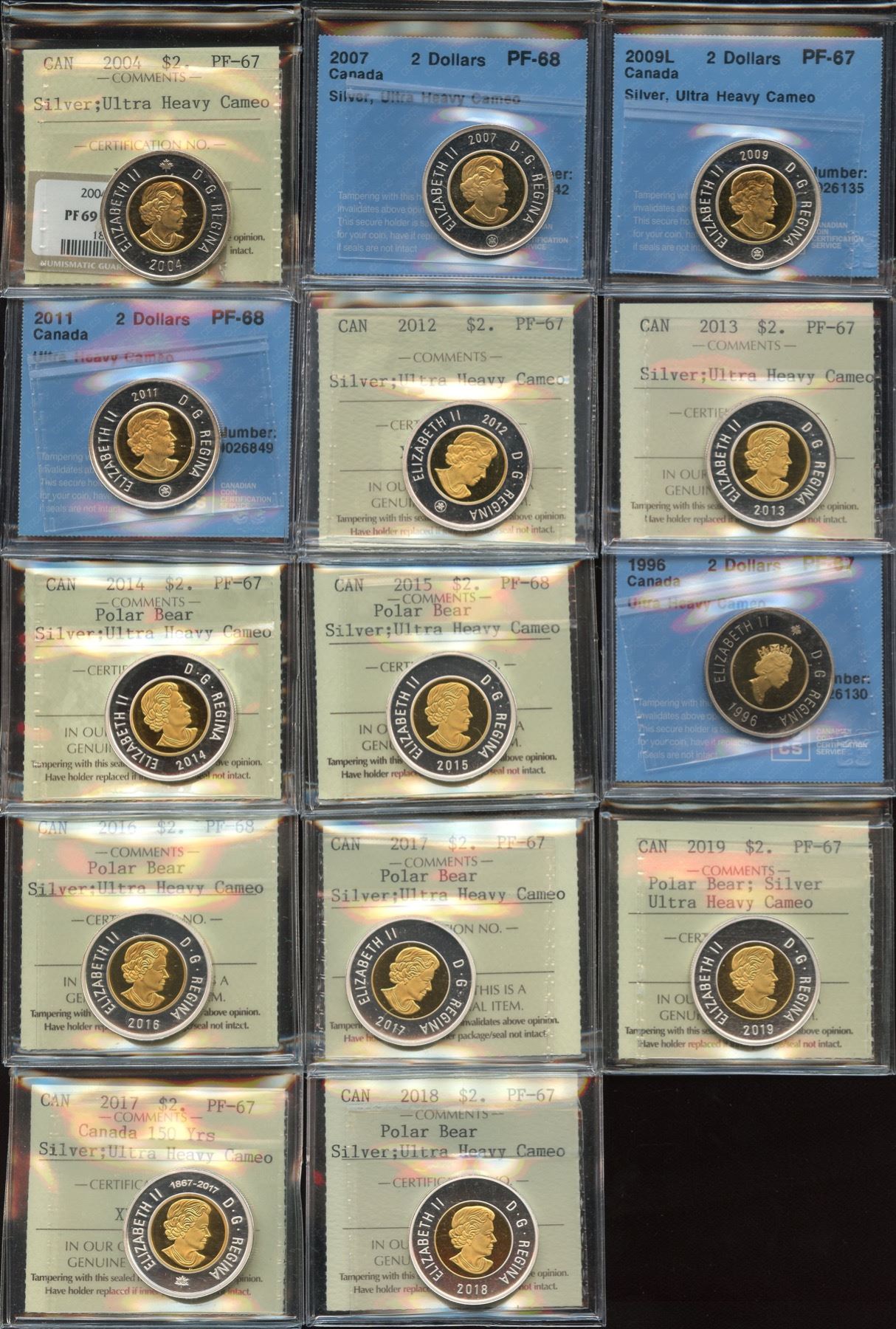 Includes: 1996 CCCS PF-67, UHC. 2004 ICCS PF-67, silver, UHC. 2007 CCCS PF-68, silver, UHC. 2009 CCCS PF-67, silver, UHC. 2011 CCCS PF-68, silver, UHC. 2012 ICCS PF-67, silver, UHC. 2013 ICCS PF-67, silver, UHC. 2014 ICCS PF-67, silver polar bear, UHC. 2015 ICCS PF-68, silver polar bear, UHC. 2016 ICCS PF-68, silver polar bear, UHC. 2017 ICCS PF-67, silver polar bear, UHC. 2017 ICCS PF-67, silver 150 years, UHC. 2018 ICCS PF-67, silver polar bear, UHC. 2017 ICCS PF-67, silver polar bear, UHC. 2019 ICCS PF-67, silver polar bear, UHC. 14 Pcs.