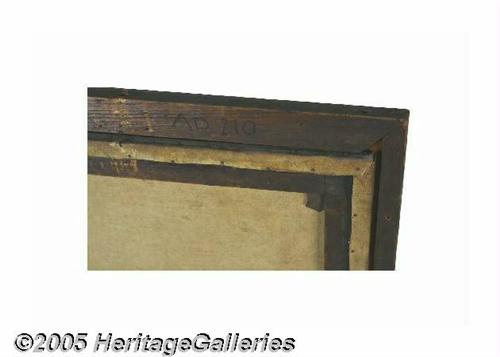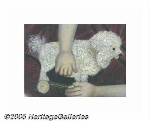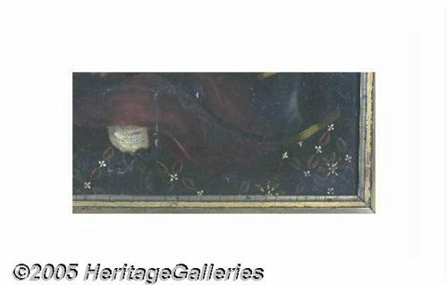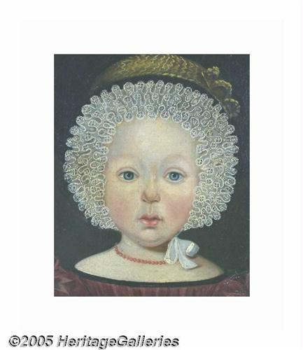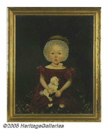<B>Superb Large Example of Early American Regional Folk Art Portraiture</B></I> Oil on canvas, depicting a young child clutching a wheeled toy dog. The head is exaggerated, and the body gets smaller in scale as the eye moves lower. In all probability it is a young girl, although it was not unheard of to dress boys in this fashion! Very fine artistic quality, with lifelike face and wonderful detail, particularly in the lacy cap and the patterned carpet. According to a respected art museum curator of 19th century American paintings, this work is hard to date without knowing its exact provenance. If painted in the developed northeast, it could well be from the first quarter of the nineteenth century. But if it comes from farther west, Indiana or Illinois, it could date from the 1830s. The painting was re-lined some years ago, and the notation "painted by W. Bazin" is found on the reverse, presumably copies from an inscription on the back of the original canvas. Exhaustive research fails to disclose a record of any artist by the name. This is disappointing, but not surprising, as there were many capable local artists doing such work at the time. The frame is certainly period and could well be original to the piece and is in excellent condition. The wood over which the canvas is stretched appears original. The painting itself has a pleasing display appearance, although some professional conservation is recommended. A 1 1/2" tear in the field was mended long ago, but would benefit from being re-done. There are two fine intersecting cracks on the lower fold of the dress, and there has been some minute flaking there. This is an easy restoration, but one which should be accomplished. Most importantly, the painting needs a good professional cleaning. It is now covered by multiple layers of old varnish, and according to the curator we consulted, the colors and detail would really "come to life" with a standard cleaning. We first encountered this painting when it hung above the fireplace in an elegant Philadelphia Main Line home, in a parlor beautifully decorated with period furniture and accessories. But this little girl's plaintive expression and piercing blue eyes immediately drew our attention and continued to hold us captive. According to the museum curator with whom we consulted, it is a very fine example of its genre (indeed she lobbied persuasively for its donation to the museum!). A rich and highly personal work which will be the focal point of any room. 23.25" x 29.25", 28.5" x 34.5" as framed. Lot:252