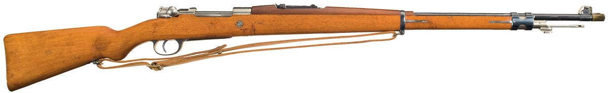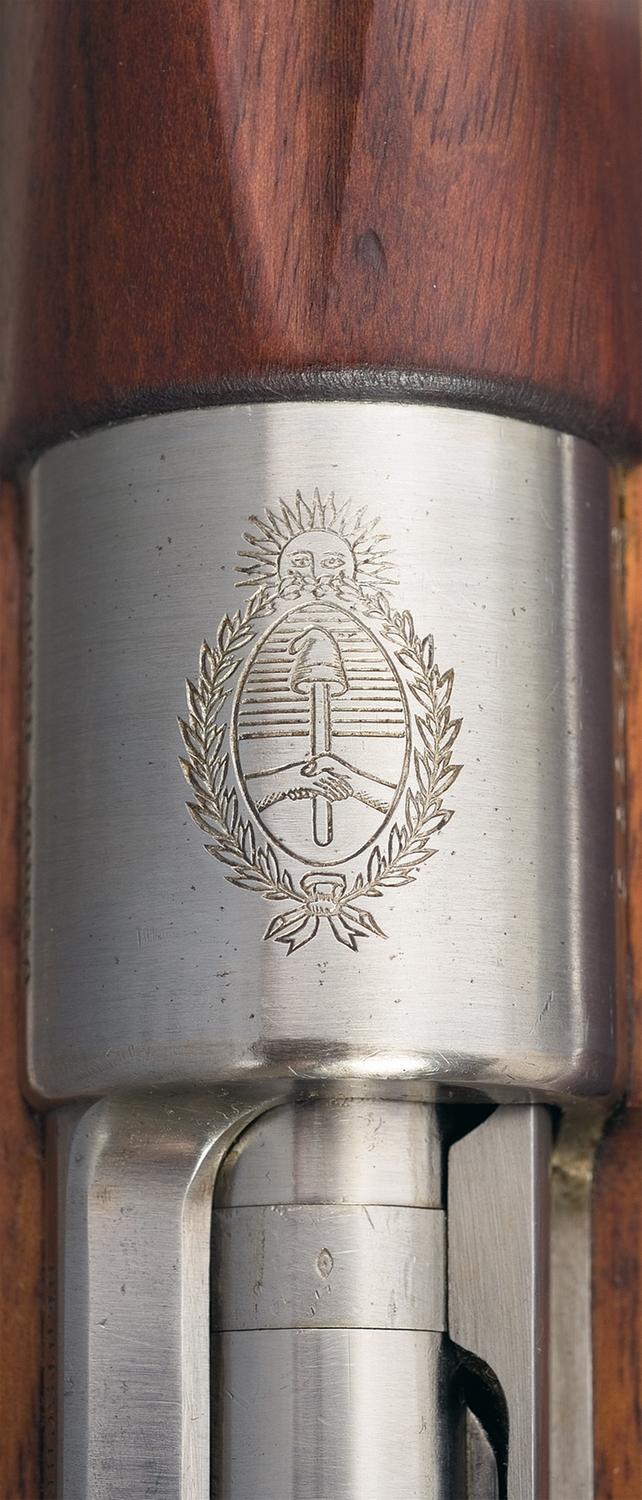 An exceptional near mint example of a prewar Mauser contract rifle manufactured for the government of Argentina. Blade and tangent sights, with the Argentine crest on top of the receiver ring, "MAUSER MODELO/ ARGENTINO 1909." on the left, and the DWM address on the sidewall. The rear sight has a small Argentine Navy "anchor" proof. An import mark is present on the right side of the barrel. Smooth stock numbered to match the gun, with the Argentinean inspectors proof on the right side of the buttstock, and a few other small stamps. With muzzle cover.