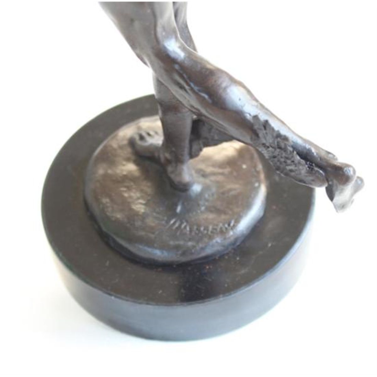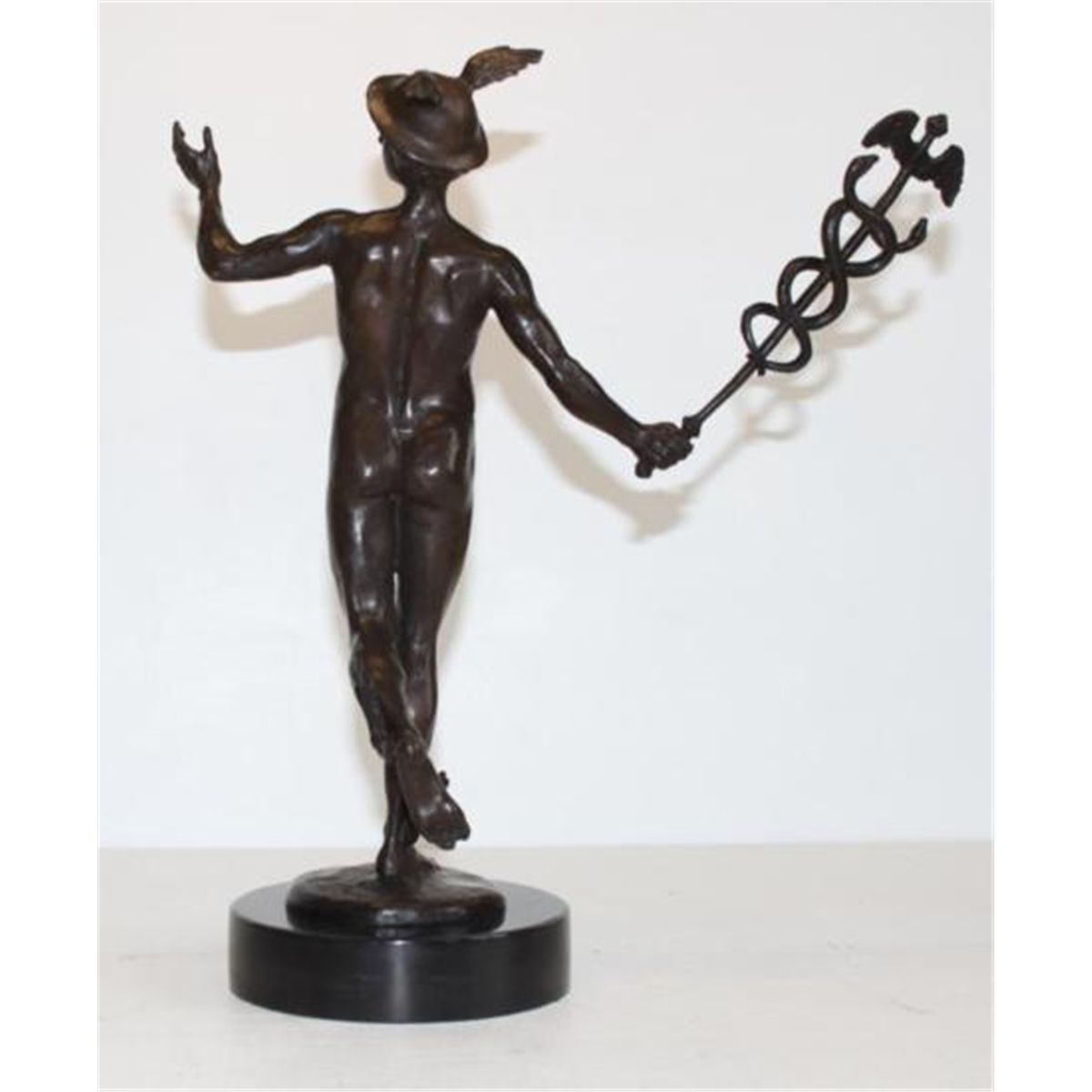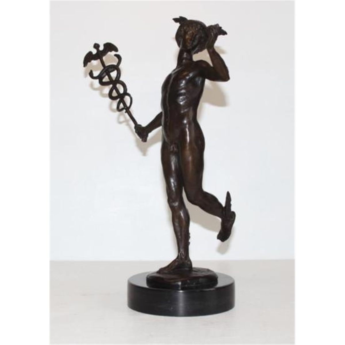 Superb Nude Mercury and Caduceus, Bronze Sculpture, After Fix Masseau 13 1/2" H x 11"W x 6"D 10lbs. This bronze sculpture was produced using the Lost Wax casting method. The Lost Wax Cast method is the most precise metal casting technique in existence, ensuring exquisite detail of the original host model which is usually sculpted in clay or wax. This Lost Wax casting method is an extremely labor intensive and expensive process, but the end results produce a Heirloom Quality Masterpiece!