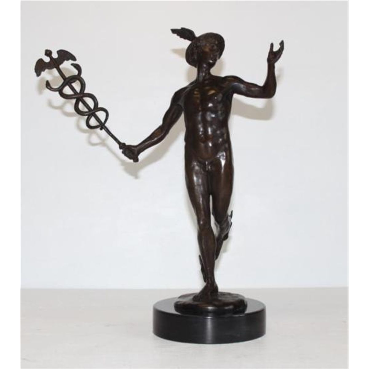 Superb Nude Mercury and Caduceus, Bronze Sculpture, After Fix Masseau 13 1/2" H x 11"W x 6"D 10lbs. This bronze sculpture was produced using the Lost Wax casting method. The Lost Wax Cast method is the most precise metal casting technique in existence, ensuring exquisite detail of the original host model which is usually sculpted in clay or wax. This Lost Wax casting method is an extremely labor intensive and expensive process, but the end results produce a Heirloom Quality Masterpiece!