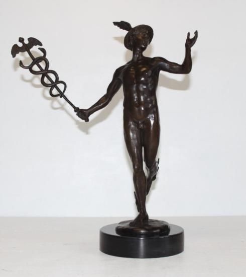 Superb Nude Mercury and Caduceus, Bronze Sculpture, After Fix Masseau 13 1/2" H x 11"W x 6"D 10lbs. This bronze sculpture was produced using the Lost Wax casting method. The Lost Wax Cast method is the most precise metal casting technique in existence, ensuring exquisite detail of the original host model which is usually sculpted in clay or wax. This Lost Wax casting method is an extremely labor intensive and expensive process, but the end results produce a Heirloom Quality Masterpiece!
