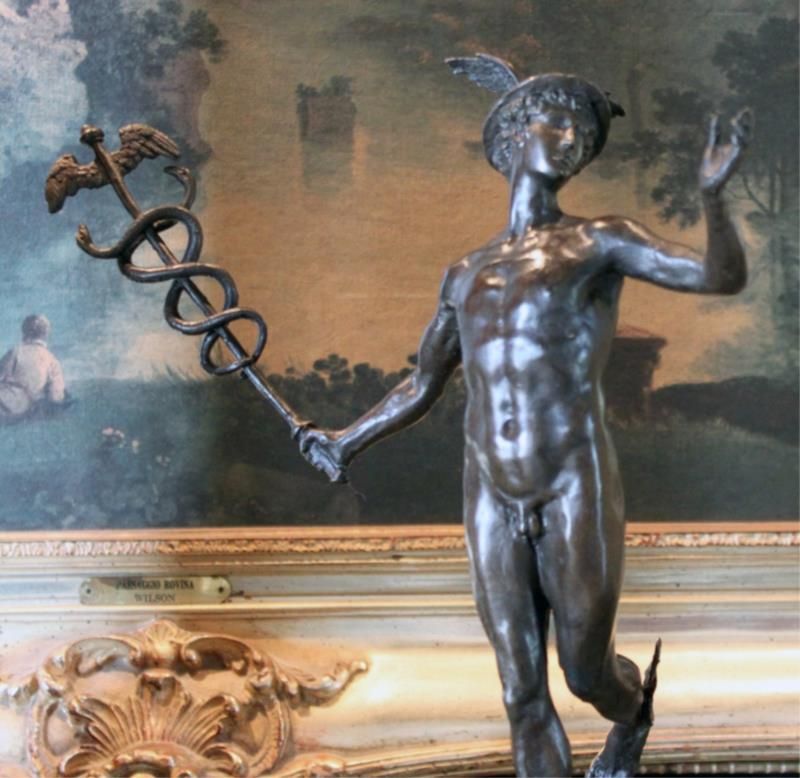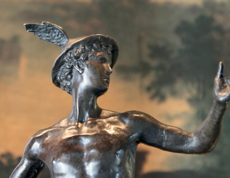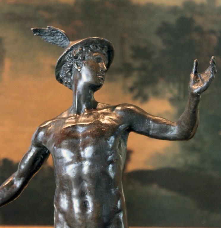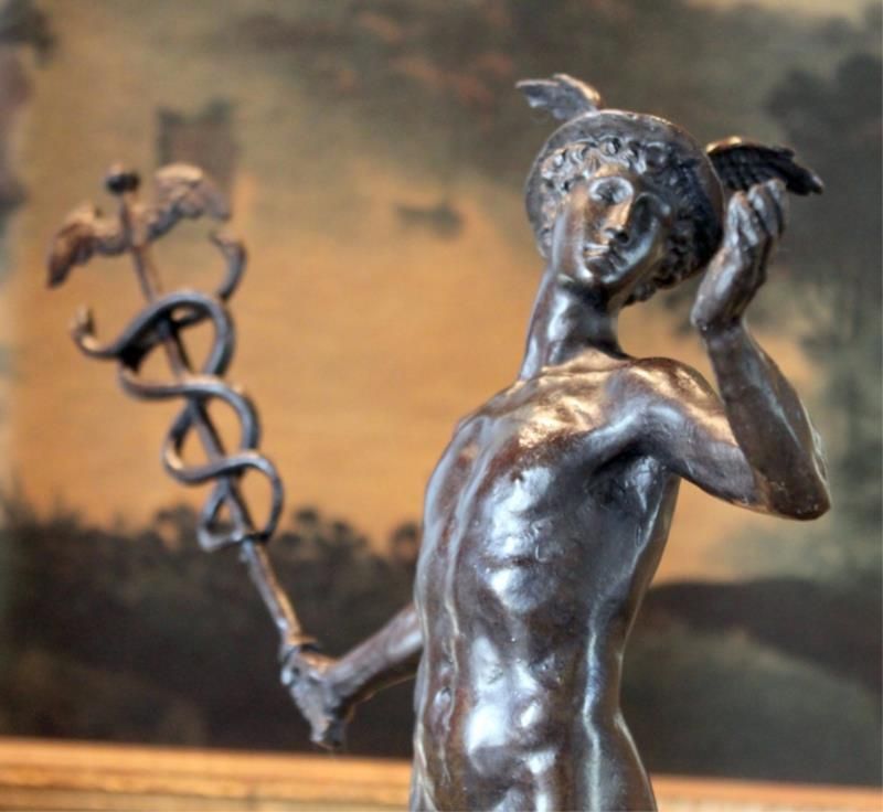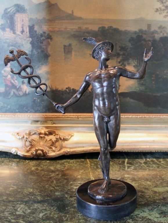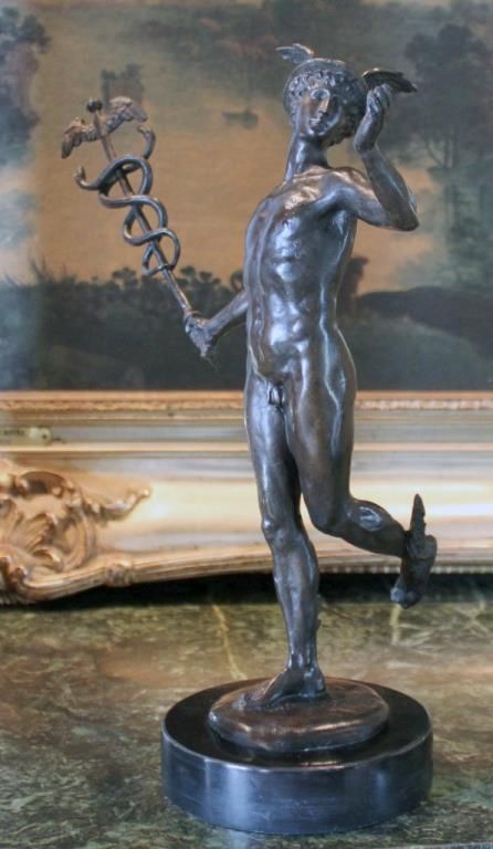 Superb Nude Mercury and Caduceus Bronze Sculpture 13 1/2H x 11W x 6D 10lbs. This bronze sculpture was produced using the "Lost Wax" casting method. The "Lost Wax" Cast method is the most precise metal casting technique in existence, ensuring exquisite detail of the original host model which is usually sculpted in clay or wax. This "Lost Wax" casting method is an extremely labor intensive and expensive process, but the end results produce a Heirloom Quality Masterpiece!