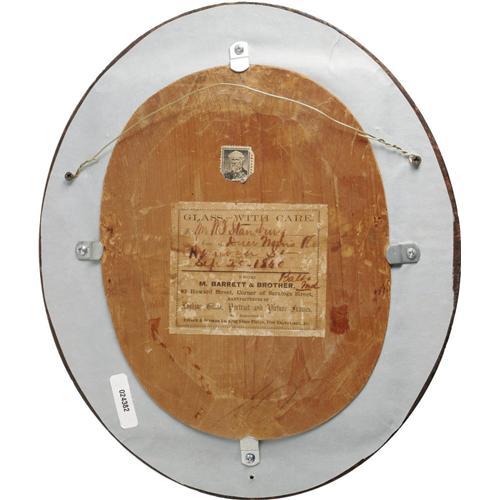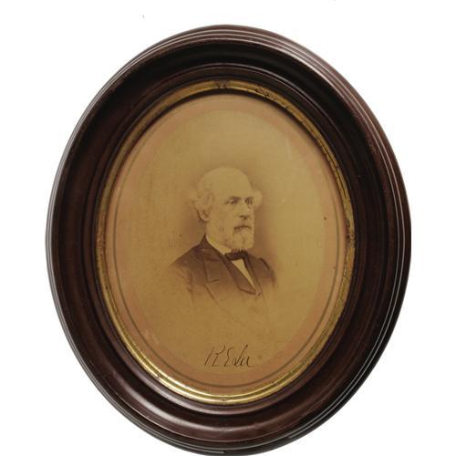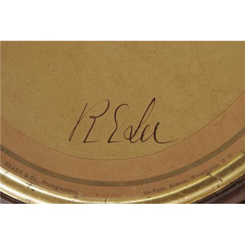 <B>Superb Post-War Portrait of Robert E. Lee Signed,</B></I> “<I>R E Lee</B></I>”, oval albumen print, 6” x 8.25”, framed to an overall 11.75” x 13.5”. Lee, as President of Washington College, wears a civilian suit in this Matthew Brady portrait taken in May, 1869. The former Confederate general consented to a studio sitting while in Washington visiting his old adversary, President U. S. Grant. The image has an earlier wooden back carrying a frame-maker's label dated September 25, 1860 and made out to a Mr. W.F. Stansbury. The whole has been placed in a more recent wood and gilt frame. An attractive deep sepia toning with a large, bold signature make this a great Lee presentation. A small water stain in the lower field does not detract in the least. Accompanying this piece is a photocopy of the frame's back with a typed note of provenance that no longer exists. It reads: “W. F. Stansbury, Jr. attended Washington & Lee College in Lexington, Virginia. Was in Ford Theatre when President Lincoln was shot, 1865. The picture of Robert E. Lee belonged to him. You will note on back of frame that it has the name of W. F. Stansbury 1860, that was our grandfather, and the frame was purchased long before the picture was framed. This frame was given to me many years later by Aunt Lily Durden, the back was in an old frame.” <BR><BR><b>Shipping:</b> Framed - with Glass, Small (<a target="_blank" href="http://www.heritageauctions.com/common/shipping.php">view shipping information</a>)