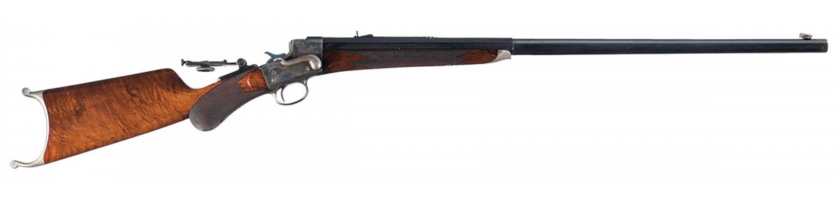 This Remington-Hepburn No. 3 Match B Quality Single Shot Target Rifle is one of less than 1,000 estimated rifles (included both A and B Quality rifles) manufactured from 1883 to 1907. These scarce rifles were manufactured for fine target shooting in short and mid-range matches. Counterintuitively, the "B Quality" was a finer rifle than the "A Quality", coming standard with full matching checkered fancy select grain walnut, a special order feature on other Hepburns. This rifle has a heavy target weight barrel with a German silver Rocky Mountain blade front sight and a semi-buckhorn rear sight with the top flat marked "E. REMINGTON & SONS. ILION N.Y." and the underside is marked "38" and "VW SS". The rifle is also equipped with a folding short range tang sight. Matching numbers are found on the barrel, forearm and lower tang. Mounted with a checkered forearm and pistol grip stock, with nickel Schnabel tip, right handed cheekpiece and a nickel finished Swiss buttplate.