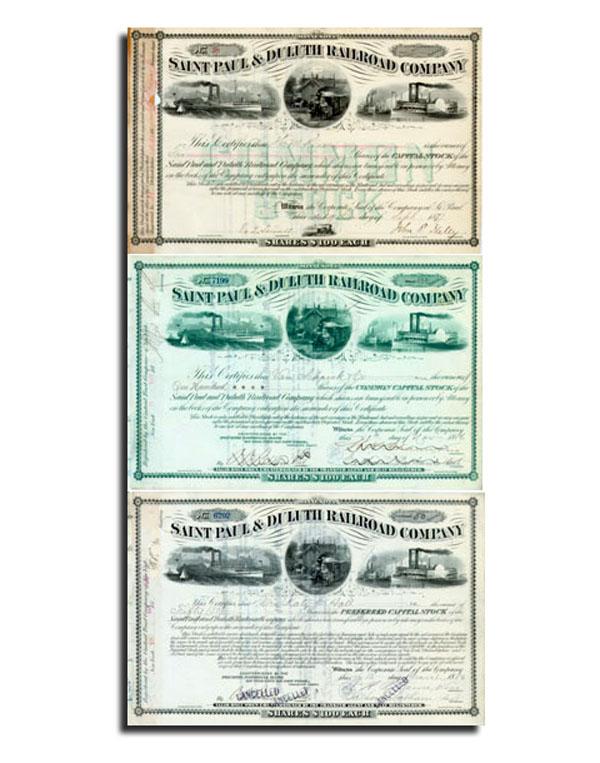 Saint Paul and Duluth Railroad Originally incorporated in 1863 and known as the Lake Superior and Mississippi Railroad the road provided the first service between Duluth and the Twin Cities upon its completion in 1870. Serving as the all-important eastern terminus of the Northern Pacific Railroad, the road linked the Great Lakes and the Mississippi River. A victim of the panic of 1873, the company defaulted on its bonds and was reorganized in 1877 as the Saint Paul and Duluth Railroad. It was absorbed by the Northern Pacific in 1900. 1880's, Minnesota. Stock certifcates. A superb set of three different stock certificates of the Saint Paul & Duluth Railroad. The large engraved top center vignette of a train leaving the train station flanked by steamships make this set truly impressive. A must for any collector.