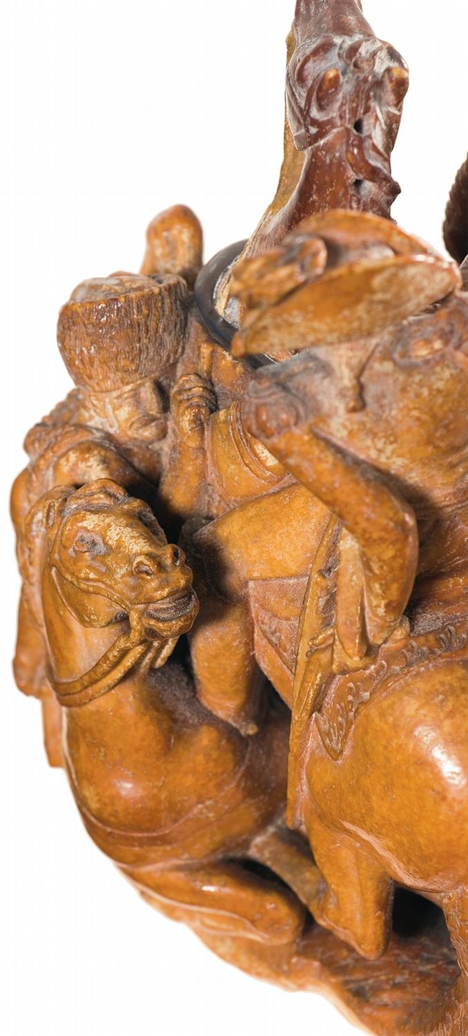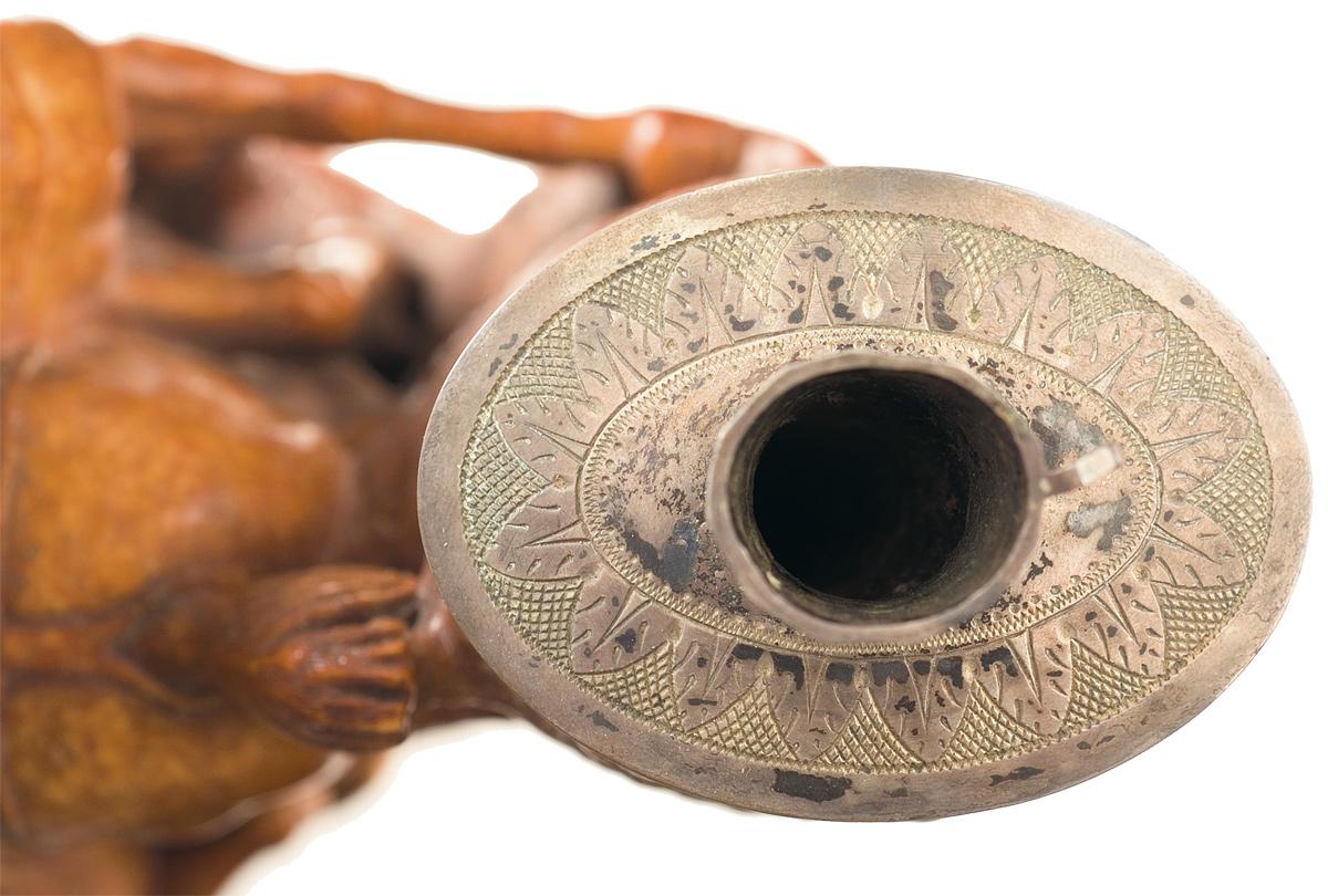 Condition: Excellent, with a small bit of replacement material for the reins on the plug, and minor handling marks on the meerschaum. The silver is excellent, with a dark patina, deepest around the neck. The stem and bit are good, with wear on the bit from use and a few minor cracks and chips on the horn and ebony parts. All together an excellent pipe, and a top notch demonstration of the carver's art with a spectacular militarty scene.
