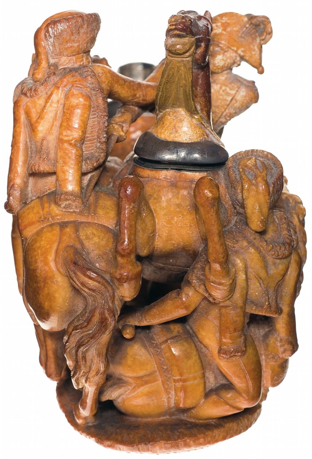 Measuring 7 1/2" long, 5" tall and 3 3/4" wide, the body of the pipe is, with sole exception of the bowl plug, made from one piece of attractively carved natural meerschaum, depicting a French cavalryman charging a pair of Russian horsemen, with the head of his horse doubling as a vented bowl plug, with silver fittings at the joint. The cavalryman can be seen drawing a pistol with his left hand and thrusting at the horseman to his right, missing both man and horse, while overrunning the second horseman. Meanwhile the horseman to the right has struck true, driving his sword up to the hilt in the Frenchman's right breast, sending it out his left side below the ribcage in what is no doubt a fatal blow. The underside of the pipe shows a light floral pattern, with the sides and rear done in a basket weave design. The rear of the pipe is capped with a floral and checker engraved silver cap with an octagonal neck for the stem, which is horn with stag and ebony accents, 8 1/2" long leading to an ebony and horn bit with woven tube and multicolored tassels, 10 1/2" long. The body of the pipe shows the distinct meerschaum patina, lighter on the underside, with the remainder turned a deep mixed orange, transitioning to a reddish brown at the plug, and the level of detail is superb, down to individual accents on the saddle blankets and the trim of the Russian's jackets and hats.