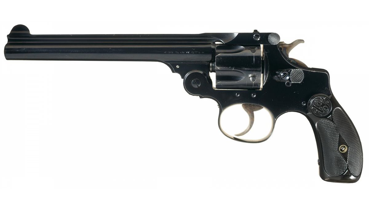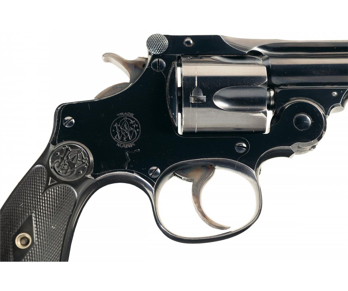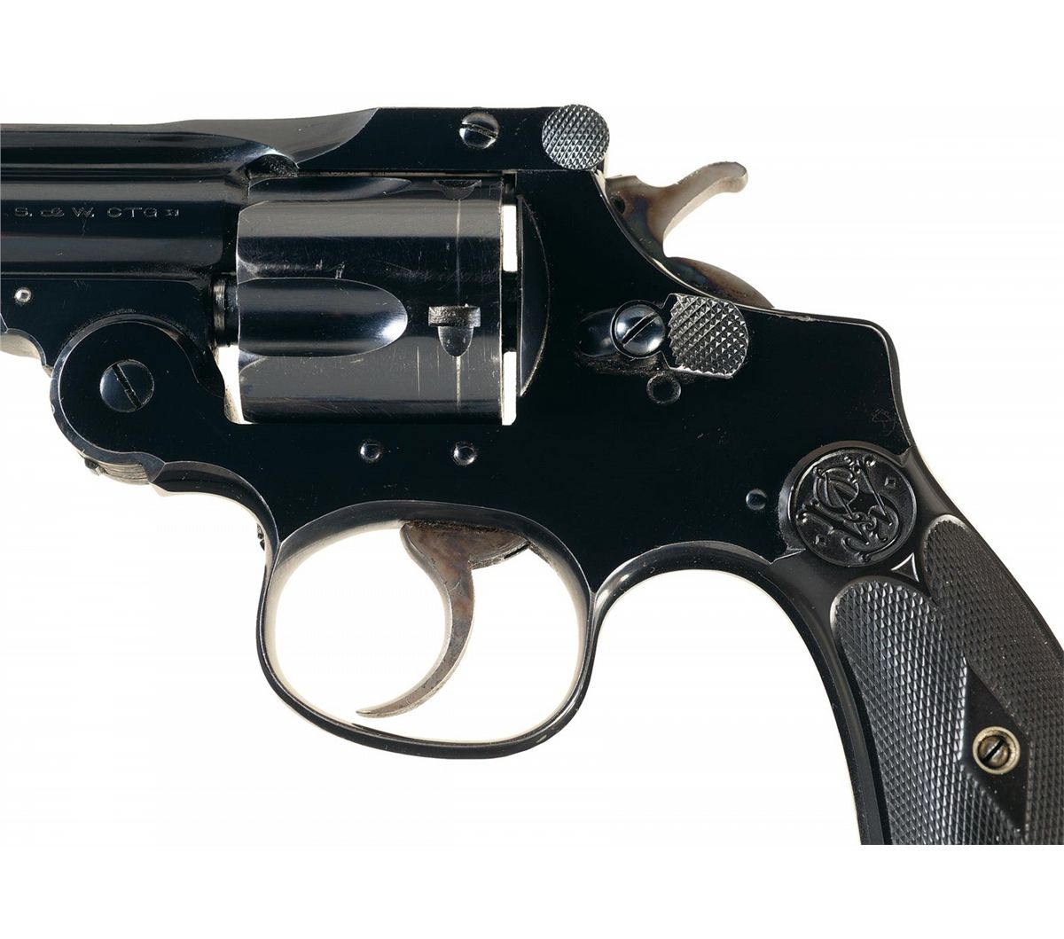 Manufactured from 1909 to 1920, this is a unique top break with both a barrel latch and a side thumb release on the left side of the frame. It is also the only Smith & Wesson top break revolver to have the trigger guard integral to the frame rather than a separate piece. Two line address/patent dates on top of the barrel rib flanked by Maltese crosses, "38 S.&W. CTG" flanked by Maltese crosses on the left side and the S&W logo on the right side plate. Integral blade front and notch rear sights. Casehardened trigger and hammer and fitted with checkered hard rubber grips with S&W logo at the top. Matching numbers on the frame, right grip panel, cylinder, latch and barrel. The included factory letter confirms the barrel length, blue finish and hard rubber grips. The revolver was shipped on Feb. 20, 1913 to H&D Folson Arms Co., New York City.