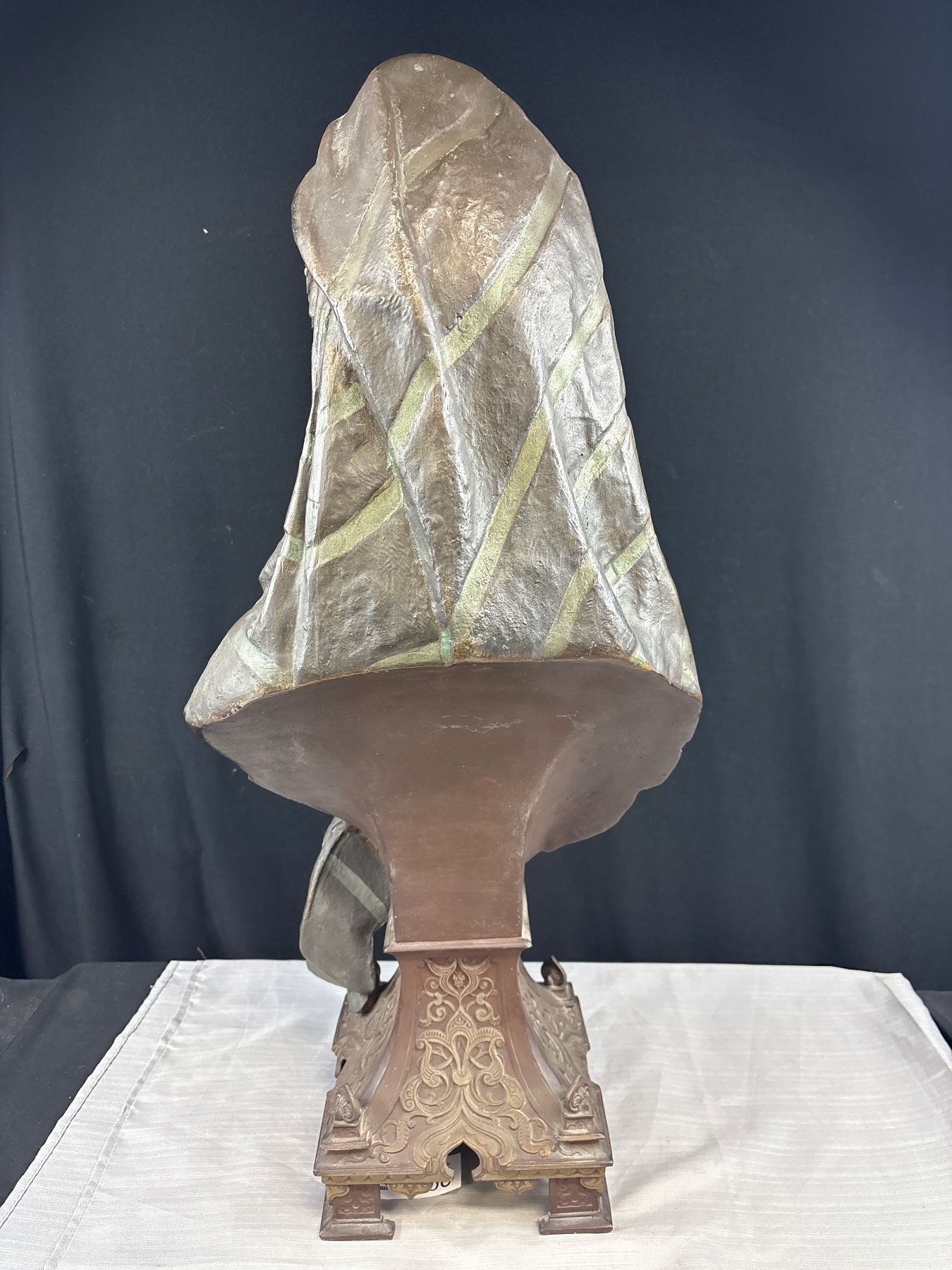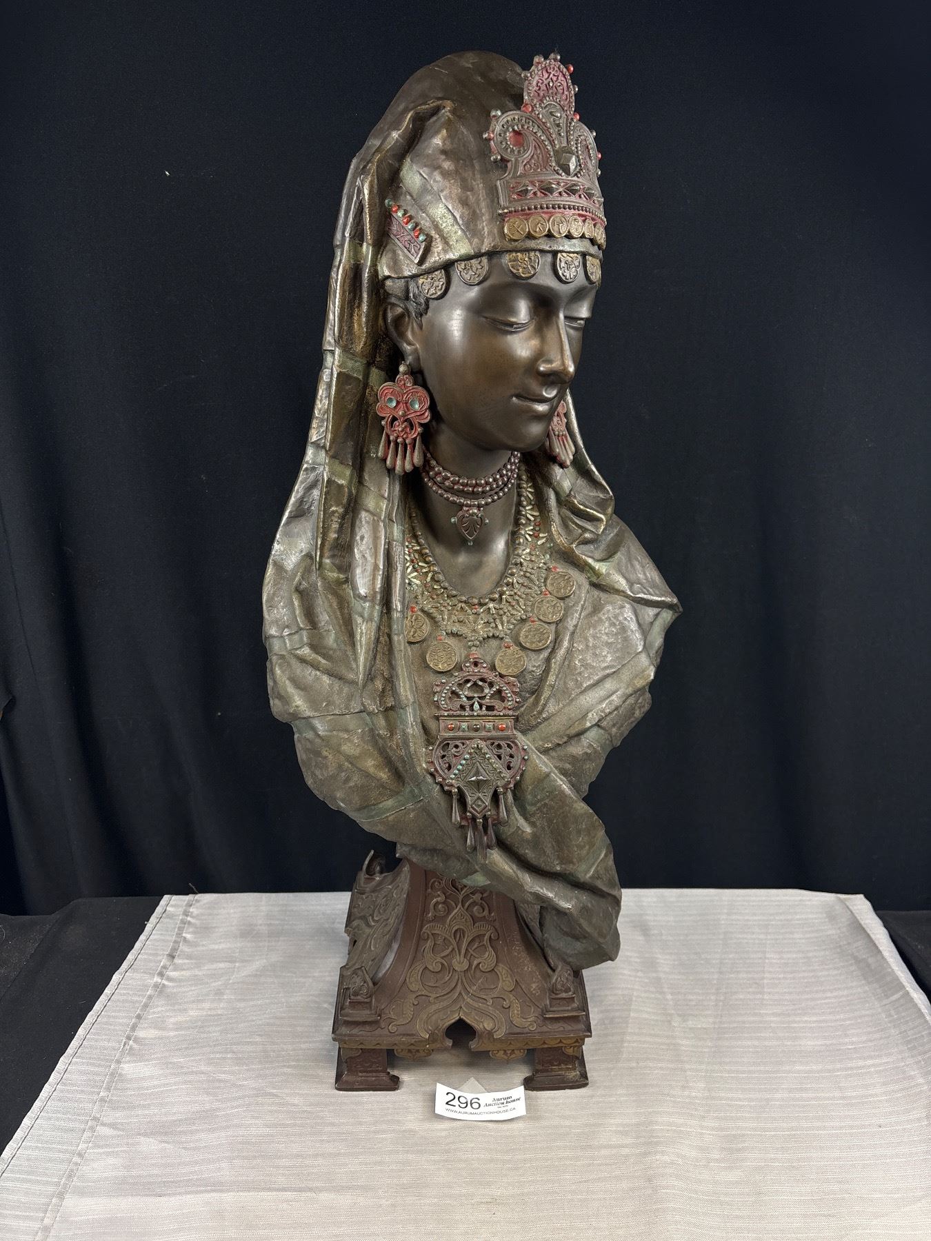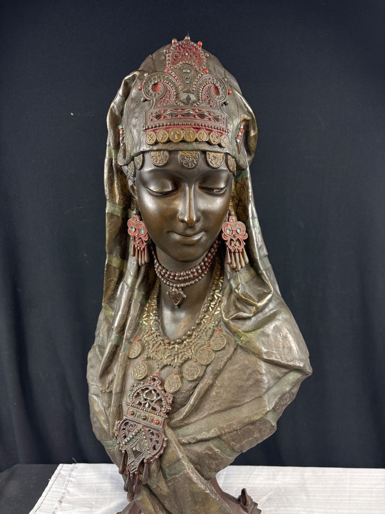Superb Spelter Bust of Arab Princess w/ Headgear, Drop Earrings and Enamel Beadwork on a Square Brace w/ Bracelet Feet 29" Tall