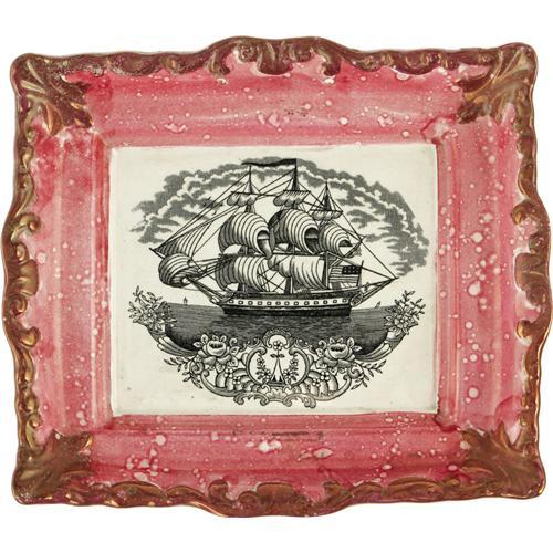 <B>Superb Sunderland Pink Luster Plaque With American Warship.</B></I> Gun ports identify this as a naval vessel, with American flag flying. Circa 1815-30. This piece is often seen with a poem at the bottom about "Peace and Plenty", this example, however, does not contain the poem. Two holes present at the top for wall mounting. No markings on the verso. Beautiful condition. 8.75" x 7.75".
