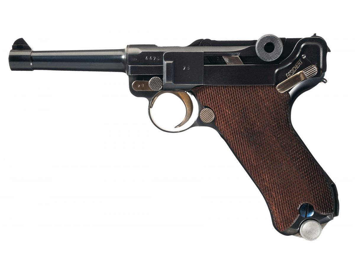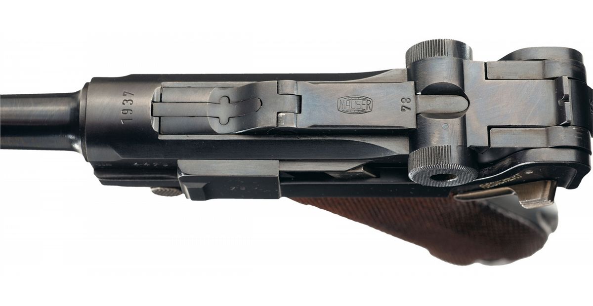 This is an example of a very a scarce mid-production Commercial contract Mauser Banner Luger Pistol. The top of the chamber is dated 1937 and it has the standard Mauser Banner trademark on the first toggle. This pistol falls into the range of those generally considered as a standard commercial Luger that was neither intended for sales outside Germany or Europe, nor a military or Police contract. The left side of the barrel extension and the left side of the breech block are all stamped with a single "Crown/U" commercial proof acceptance mark with no other proofs on the pistol. The safety components, extractor and breechblock are blank, otherwise external numbers match, including the "eagle/63" proofed magazine. Fitted with straw finished small parts, niter blue screws and pins, and checkered hardwood grips.